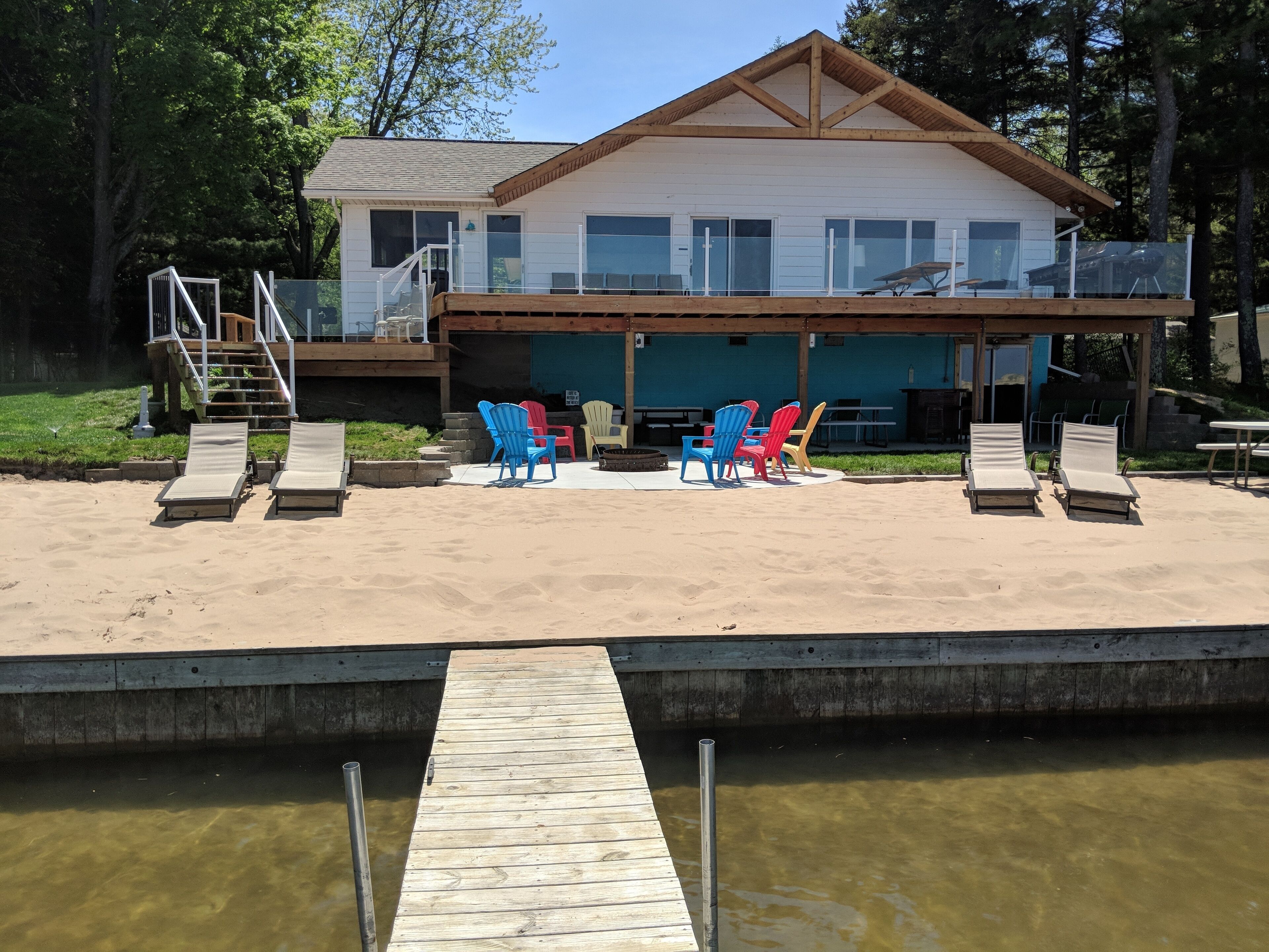 *Summer of 2020 update: Because of the record high waters, our beach area has been changing week to week. Currently we have very little beach area, but the lower deck provides an area to enjoy the lake.