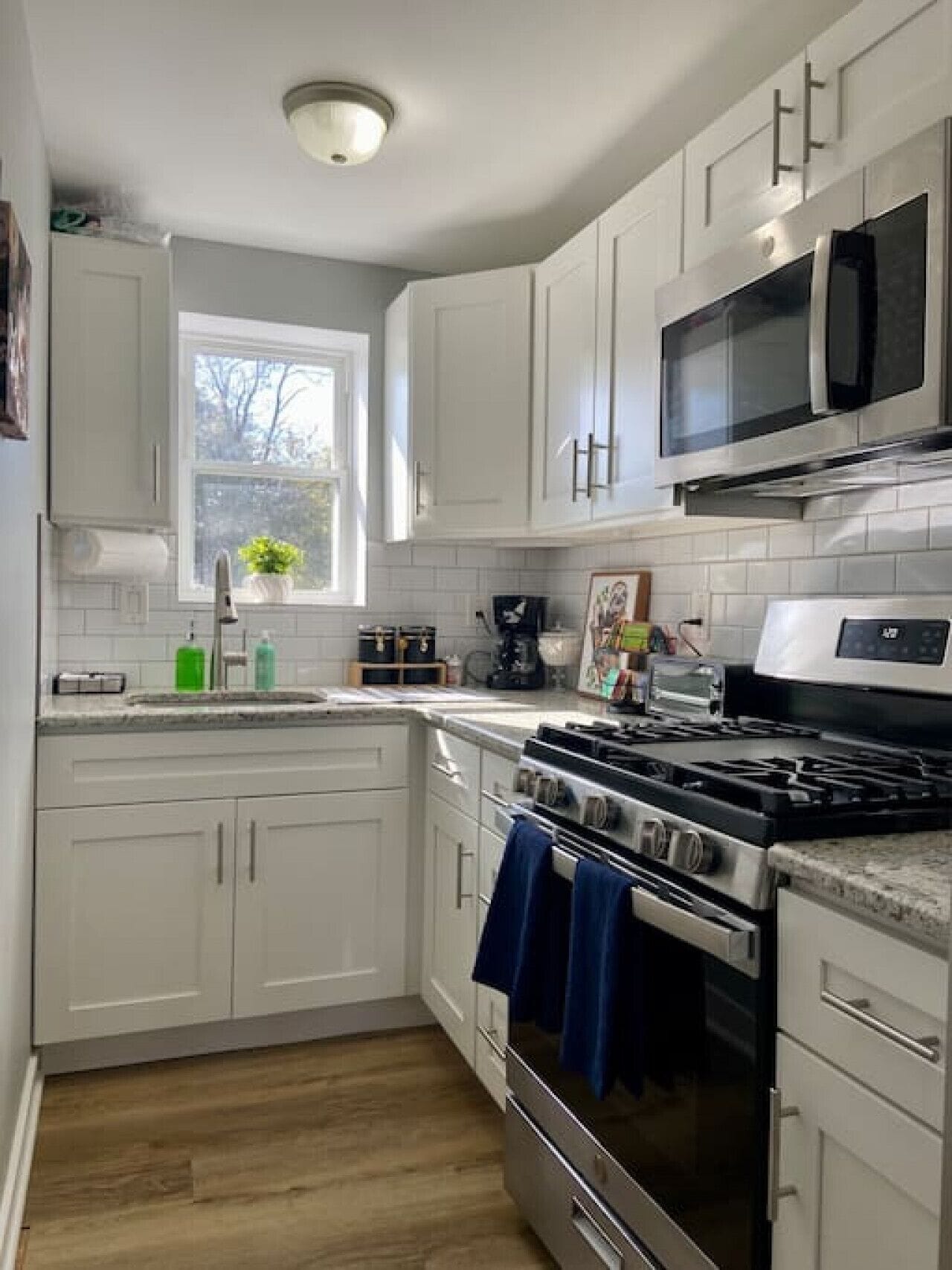 Perfect for 2 people, but can fit up to 4 with blow up mattress. Right outside of Medford Lakes, on Tuckerton Road. A completely private, spacious suite attached to a large single family home with parking spaces. 2.5 acres of space to explore, with moss trails in wooded areas throughout front and side yard, featuring a fire pit and picnic area solely for guests. 1 bed, 1 bath, with kitchen, and living room. Previously an in-law suite, the space draws from nature inspiration and has a retro decorated kitchen with a half fridge + freezer, full size electric oven, microwave, and farmhouse sink. Main entrance into kitchen with informal eating area on the kitchen island bar.