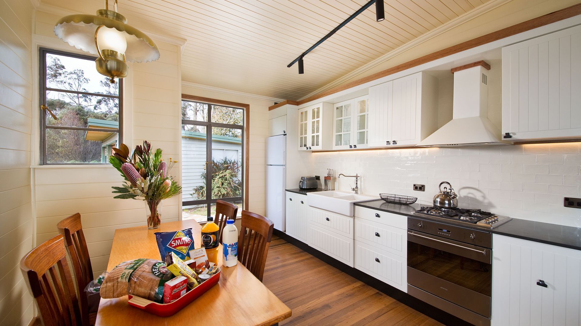 The cottage consists of three rooms and a full bathroom. The main common area includes bedroom and living area with a fireplace. The sun room boasts 180 degree bush views and includes a dining area and wood stove including complimentary wood in winter and autumn. The dining table can also be used as a workspace.