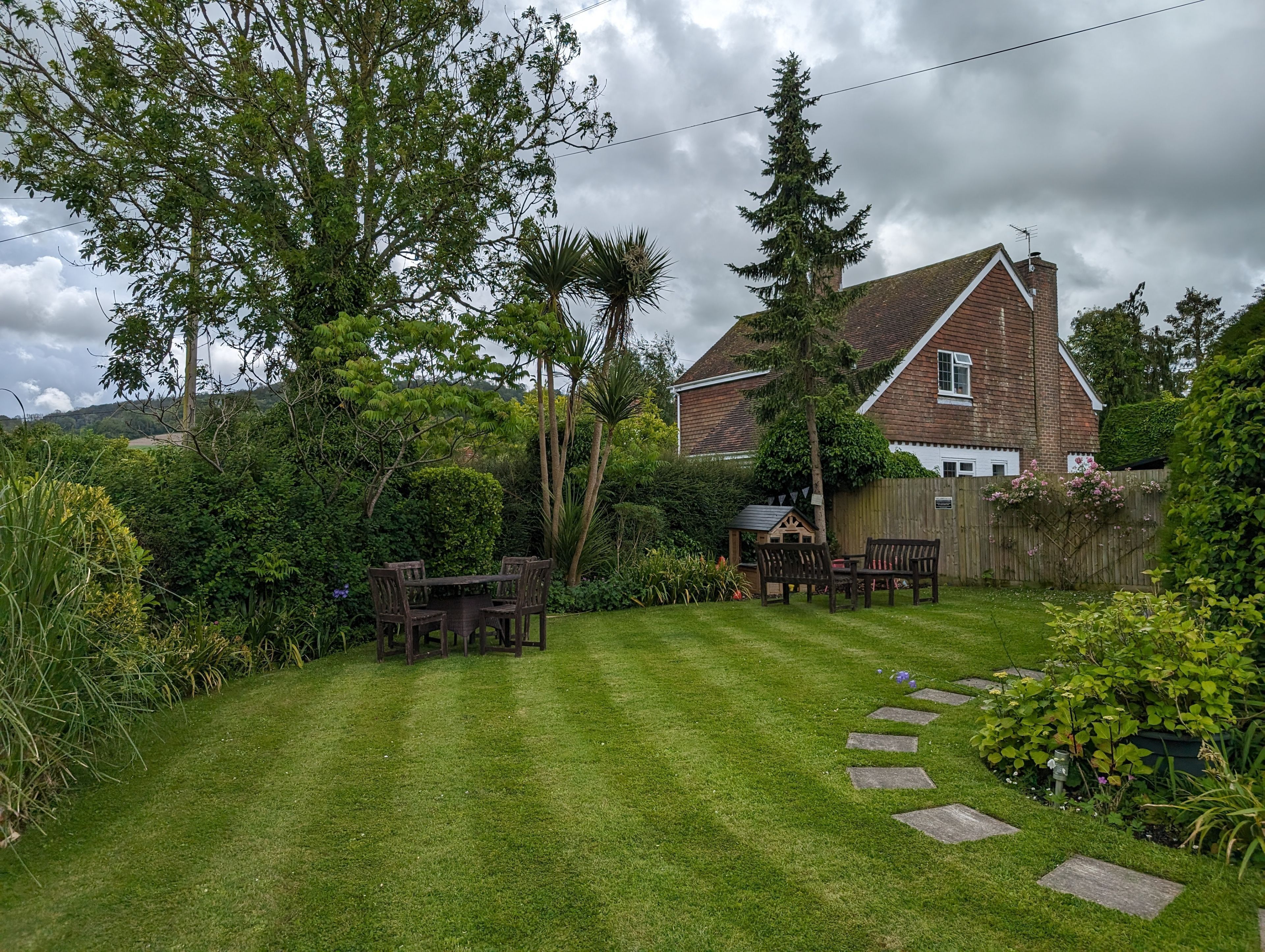 To the front of the cottage the pretty cottage style garden is lawned with seating areas and a lovely little Wendy House for children to play in.