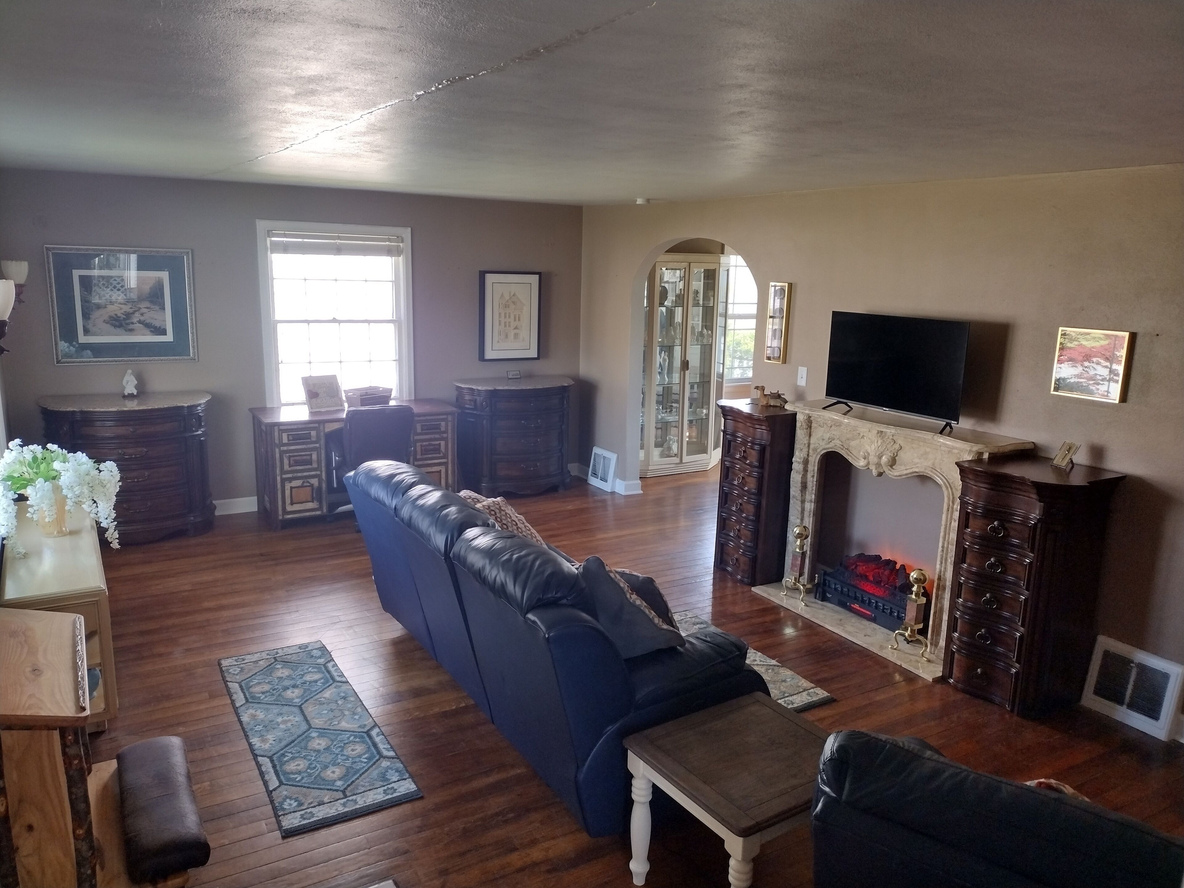 Living room seats 5 comfortably with flat screen above fireplace with cable, that leads to a full updated kitchen that is open to a dining table.