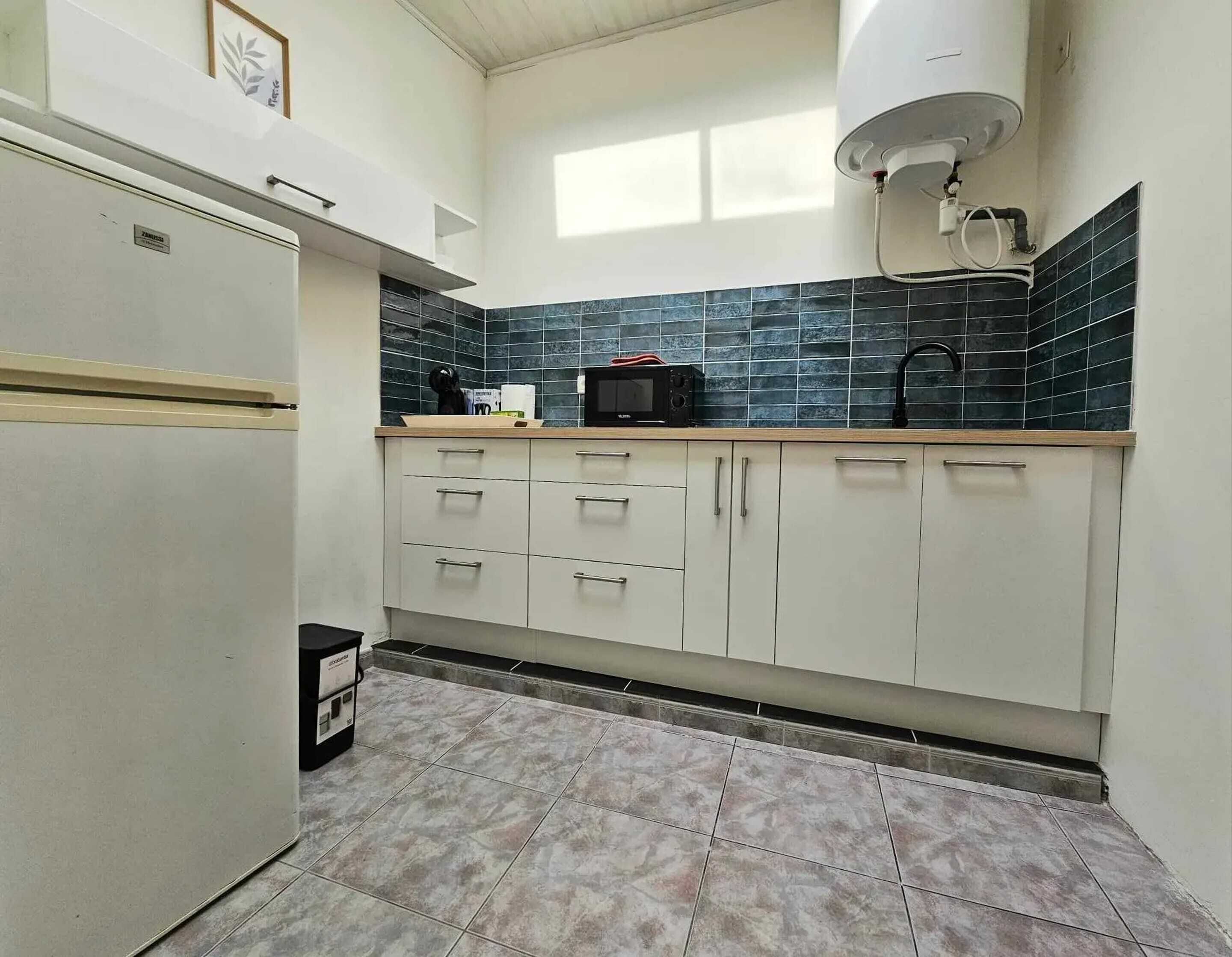 The apartment includes a welcoming living room with a sofa bed for one person, a sitting area with a flat-screen TV, and a fully equipped kitchen (refrigerator, microwave, oven, kettle, coffee maker, etc.) to prepare your meals as at home.