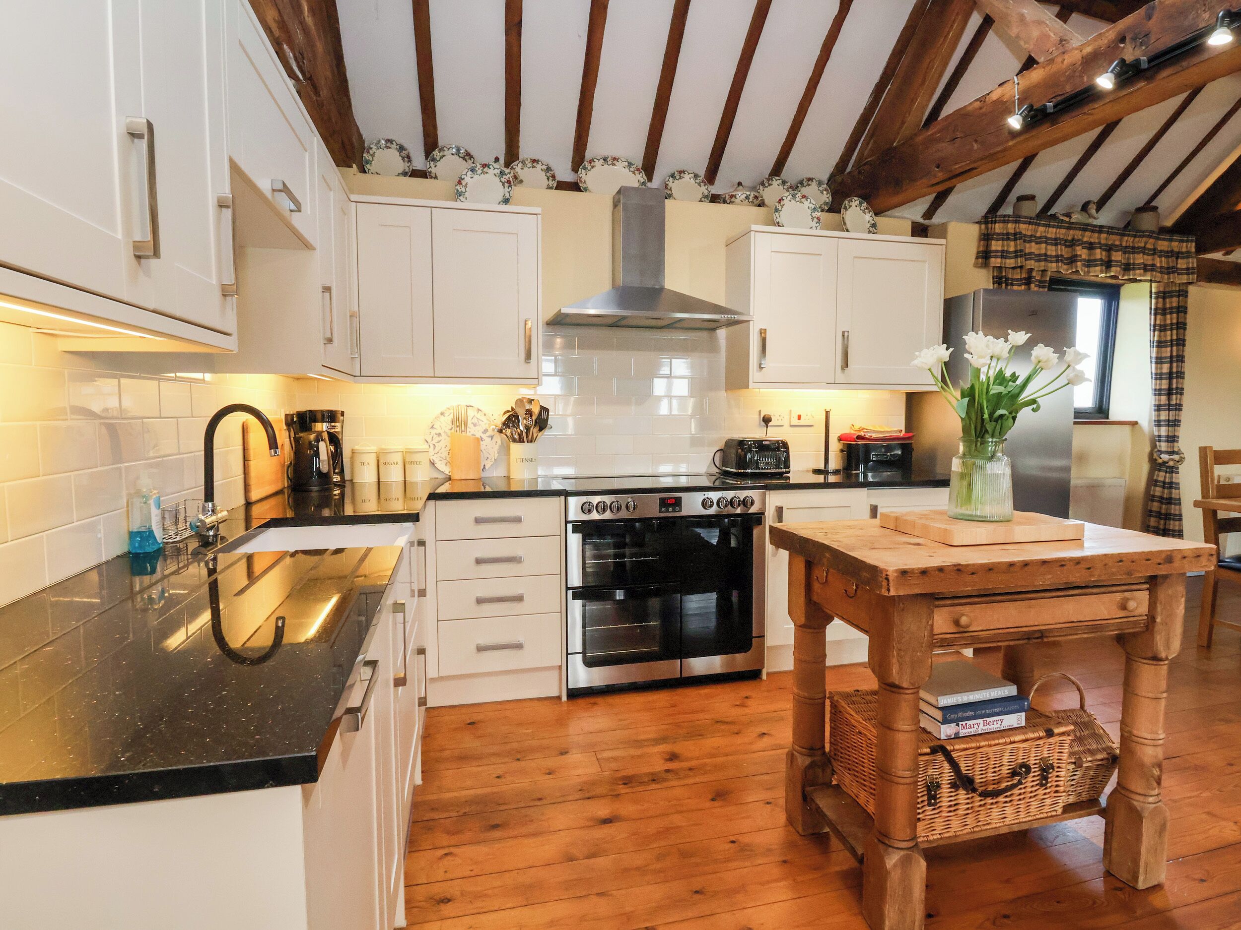 Amenities: Oil central heating. Electric oven and hob, microwave, fridge/freezer, dishwasher. Smart TV, WiFi, table tennis, dart board, selection of books and games. Fuel, power and starter pack for open fire inc. in rent. Bed linen and towels inc. in rent. Highchair and travel cot available on request. Off-road parking for 3 cars. Rear garden with lawn, patio and furniture. One well-behaved pet welcome. Sorry, no smoking. Shop 2.4 miles, pub 1.1 miles. Note: Low beams throughout, please take care. Note: Pets are only allowed on the ground floor. Note: Honesty box available to buy additional fuel for open fire. Note: Located on a working farm, but no livestock