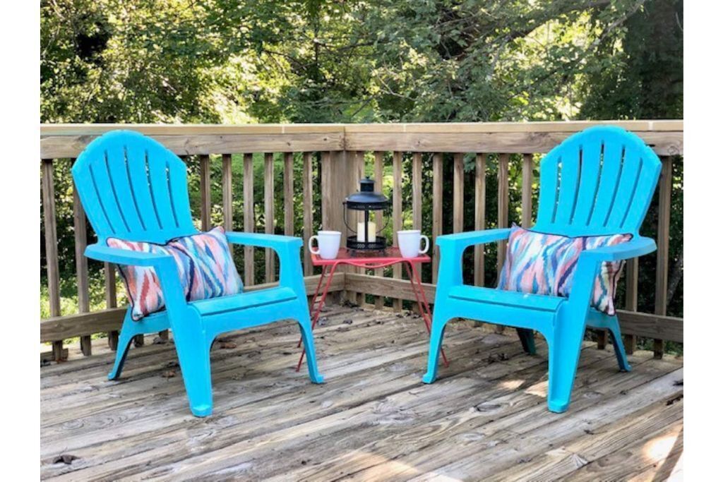 There are Adirondack chairs facing the view and several tables and chairs available for your use.