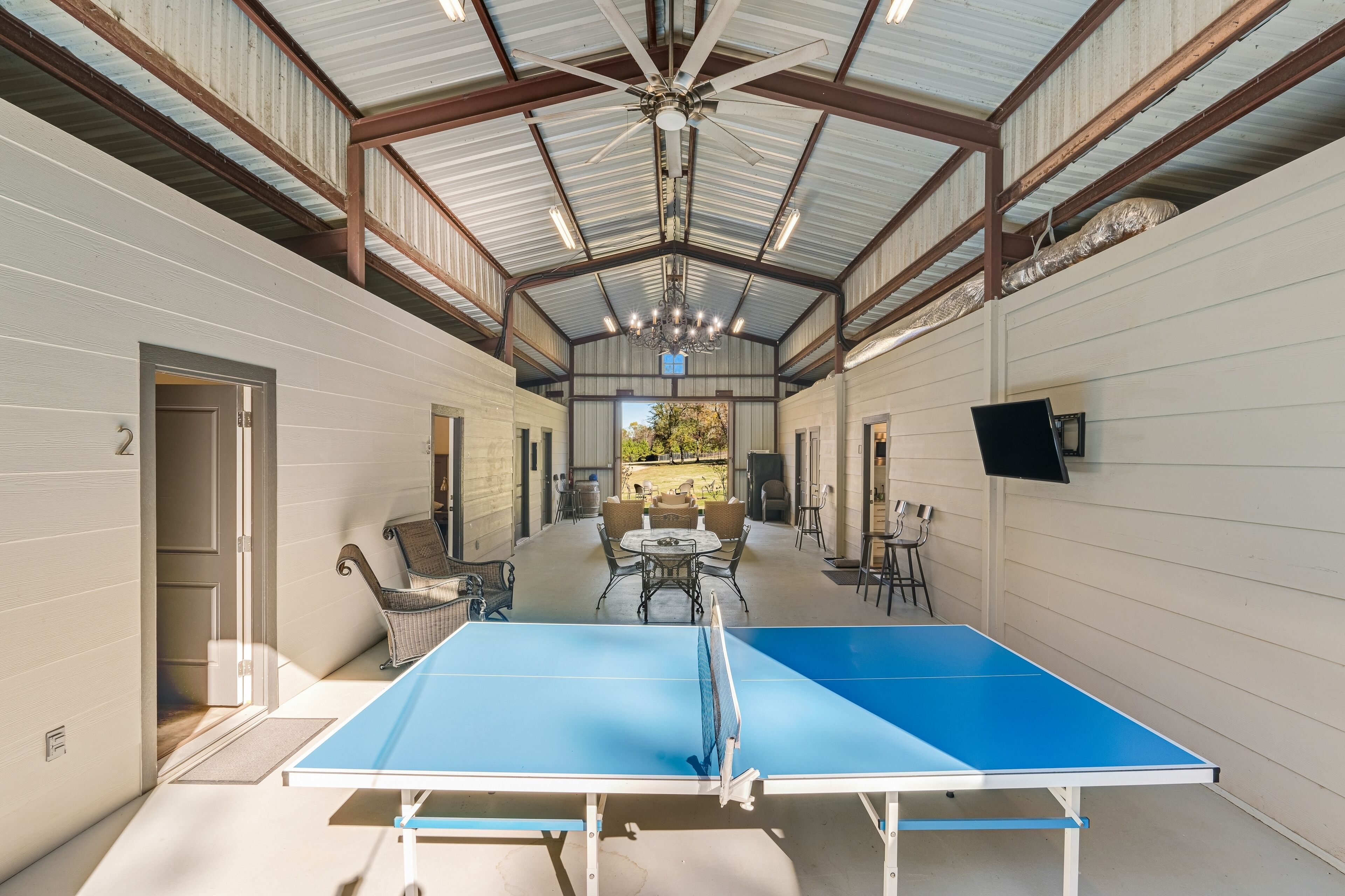 A convenient kitchenette is equipped with a full-size fridge, a sink, a microwave, and a coffee maker. Two of the guest bedrooms feature their own Keurig coffee makers for ultimate morning brew convenience. The breezeway-style living area features barn doors on either end of the space that create the perfect blend of indoor/outdoor living. Challenge your guests to a few rounds of Ping-Pong or relax while enjoying casual conversation around the sitting area. Multiple smart TVs are equipped for flexible home entertainment.