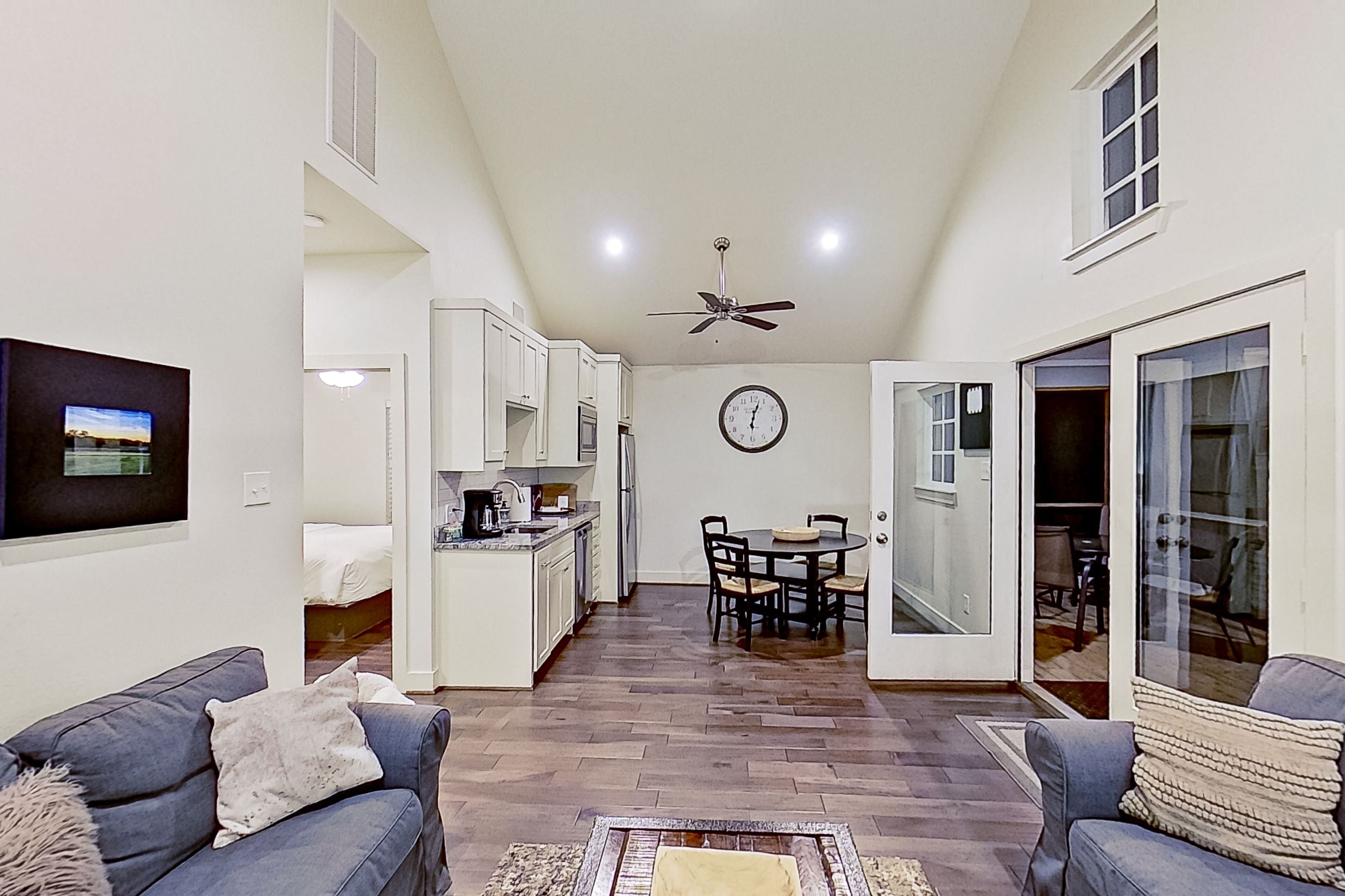 Your suite includes a convenient kitchenette and each bedroom is equipped with its own Keurig for ultimate morning brew convenience. The breezeway-style living area features barn doors on either end of the space that create the perfect blend of indoor/outdoor living. Challenge your guests to a few rounds of Ping-Pong or relax while enjoying casual conversation around the sitting area. Multiple smart TVs are equipped for flexible home entertainment.