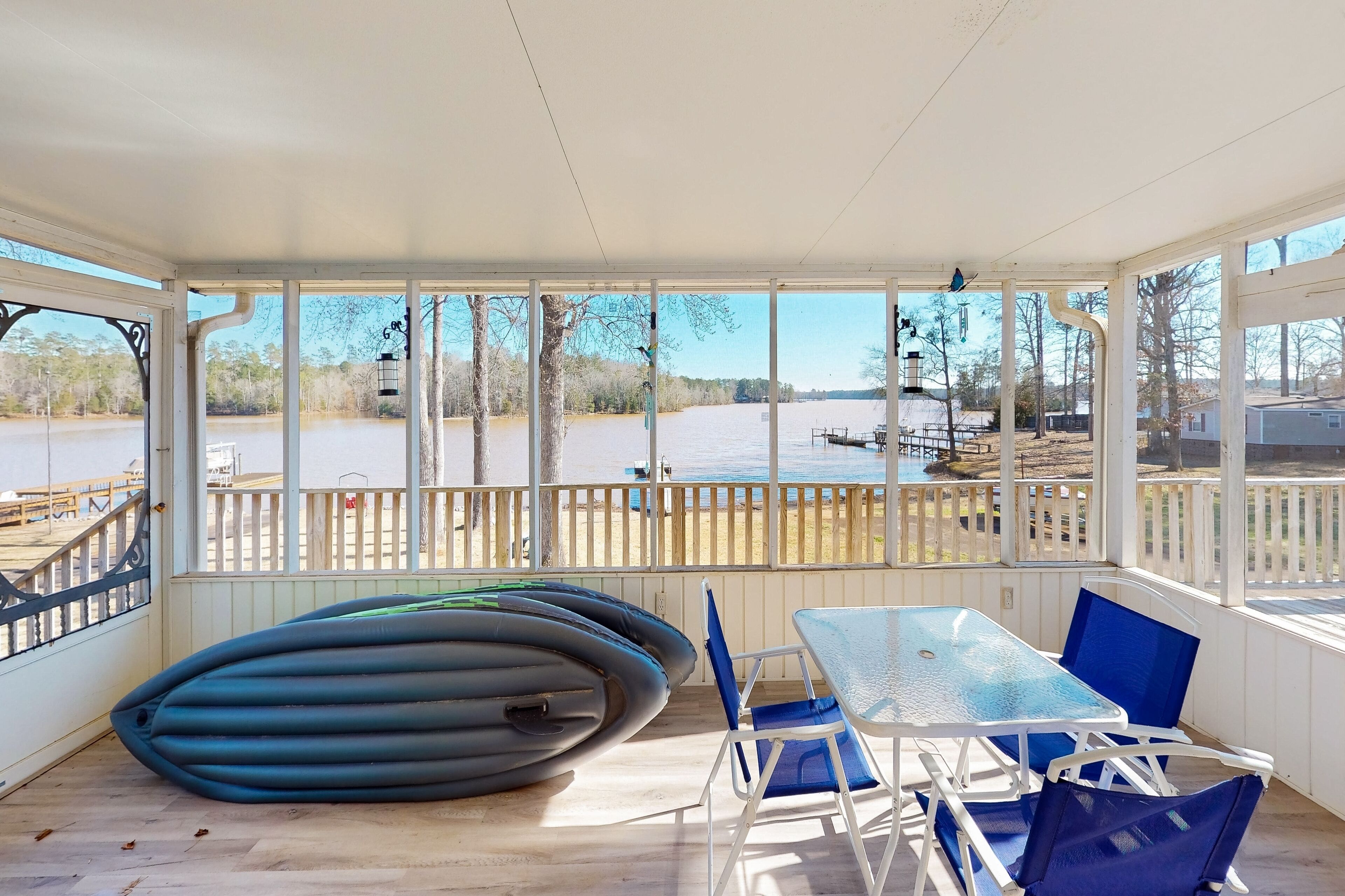 Upon entering this charming and well-appointed home away from home, you are greeted by a spacious open floor plan. Discover a welcoming living room where you can spread out comfortably after an entertaining day at the lake - curl up on any of the sofas available and watch a fun movie using the DVD player, or break out any of the provided board games. When mealtime comes, prepare exquisite homemade meals in the well-equipped kitchen, complete with all the major appliances needed. The living area seamlessly opens onto a screened porch overlooking the lake where you can dine with a view and store your water toys. Attached to the screened porch is an uncovered deck facing the lake with a gas grill. Both areas are perfect for taking in the beautiful nature with sightings of birds, deer, cranes, and herons. Additional perks include a laundry room with a washer/dryer, central AC, and a main suite with a TV and an en suite bathroom.