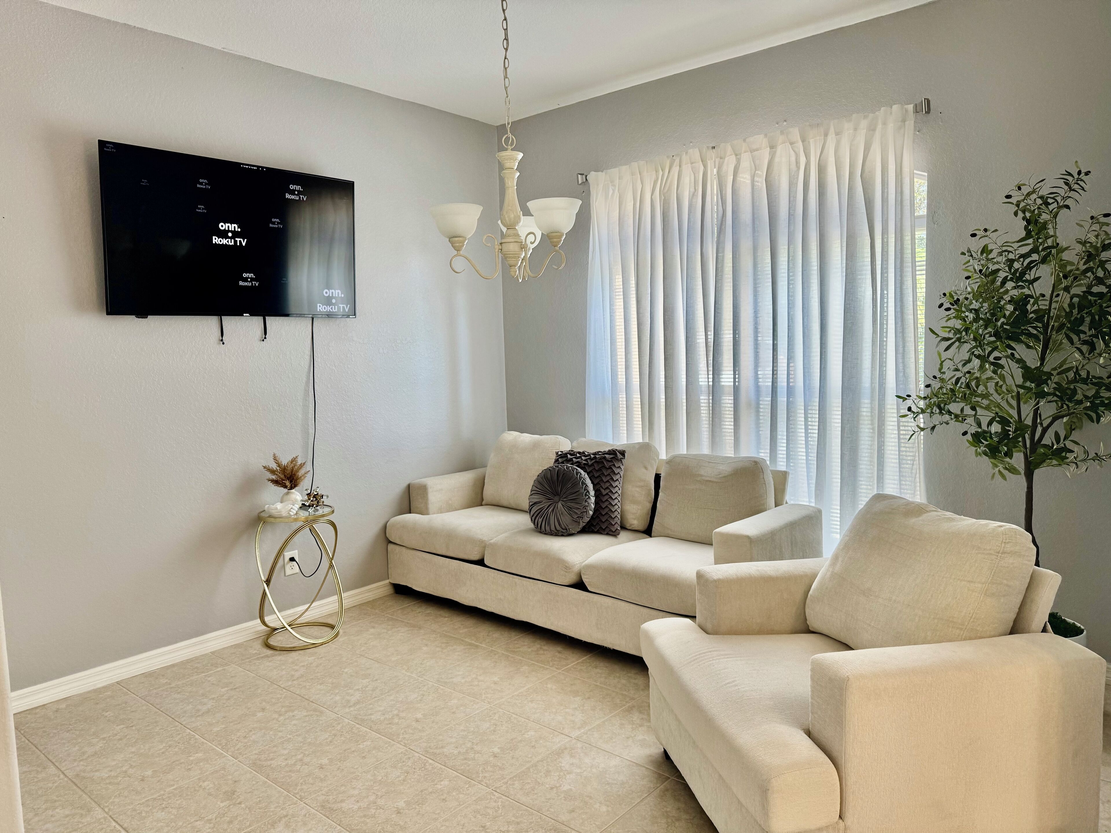 Tile floor throughout, kitchen is full of small appliances, kitchen utensils and dishware included, two couches and full size chair, a high top desk for two, laundry room has items for a few washes, cleaning supplies under the sink or closet, ice trays in freezer, extra linens and towels, beach equipment-towels, chairs, umbrella, pool noodles, smart TV in living room, Amazon fire stick in bedroom TV, big desk for working at home. Large spacious living room and bedroom. Full bathtub and towels for your use.
