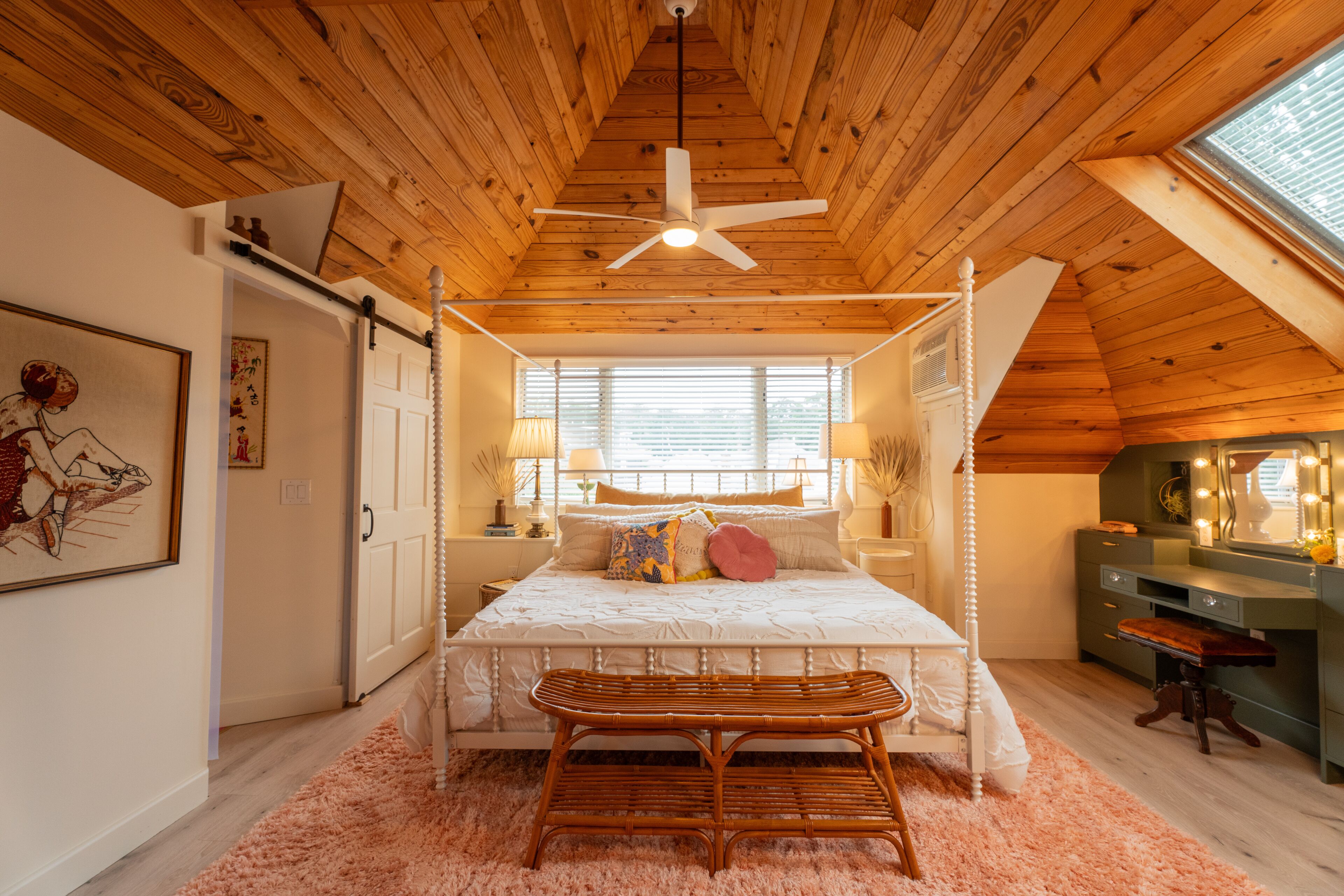 Upstairs, retreat to the master suite with a king-sized bed, lounge chair, and desk. The additional bedrooms include: