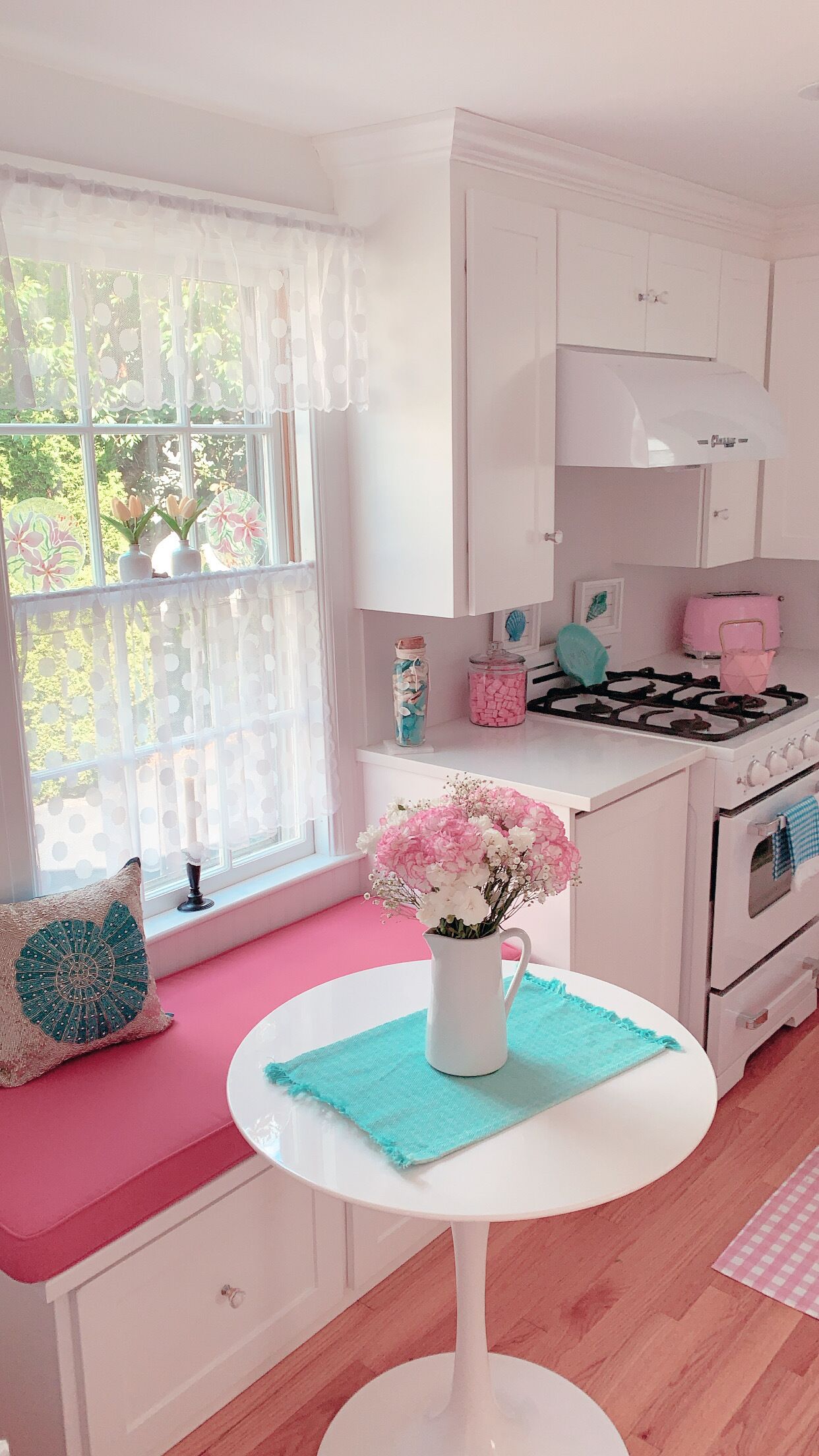 Moving into the main area, everything you need to be comfortable is on this level. There is a kitchen equipped with baking and cooking appliances, a guest wall art installation, and an extendable vintage table for activities.