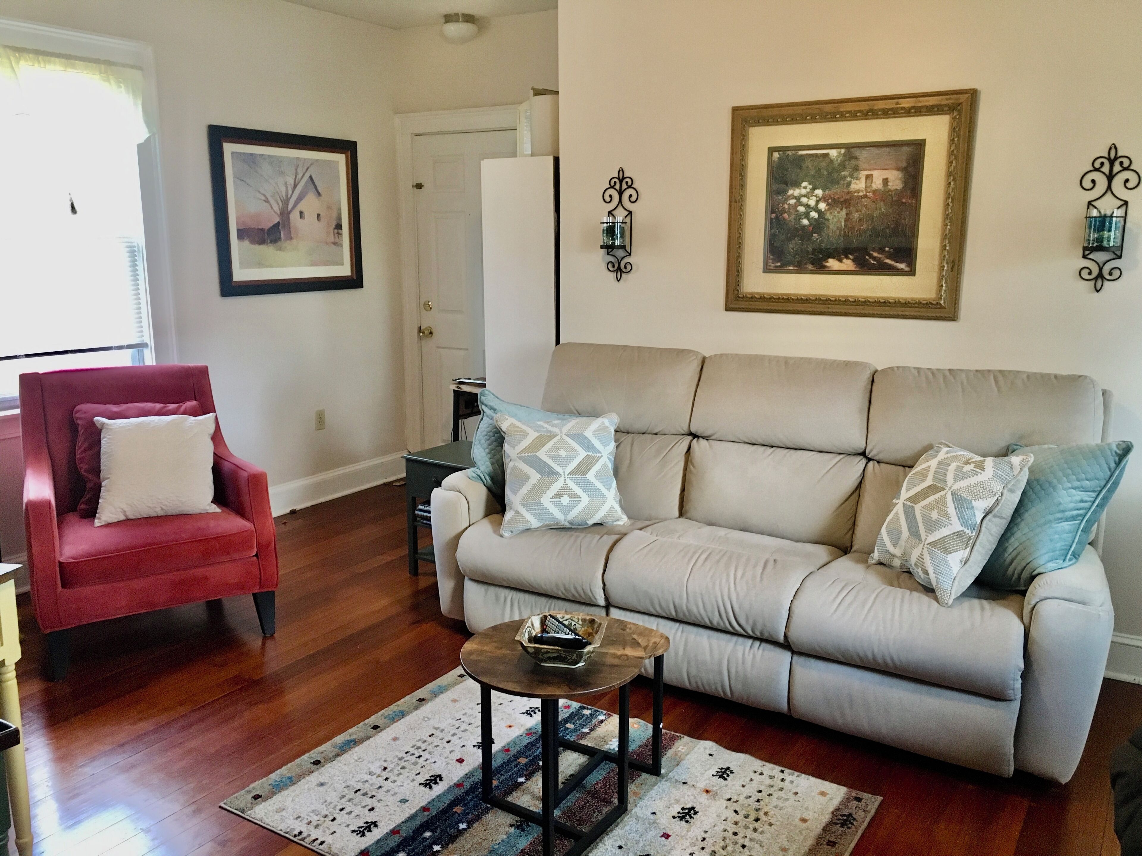 This is a very clean, bright well furnished one bedroom apartment on first floor within a larger Victorian home. Queen bed, fully accessorized. Apartment is totally private and separate. It is ideal for one person, doable for two. Two person maximum occupancy.Parking on site for ONE vehicle only.
