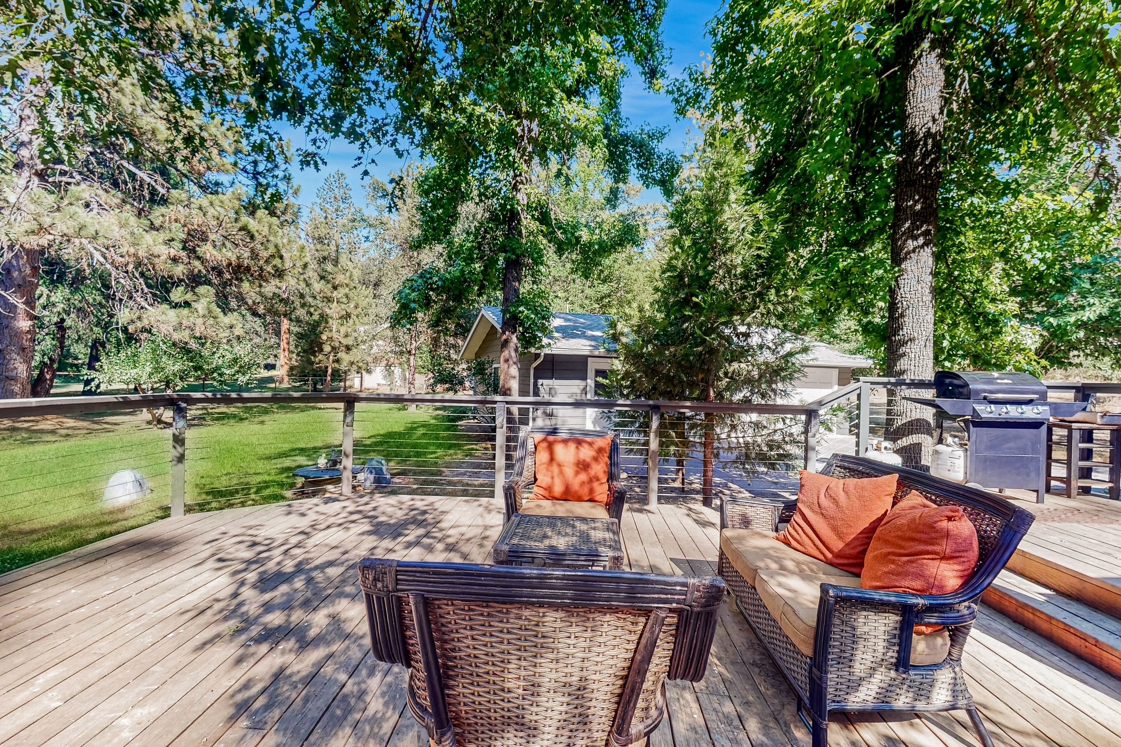 Escape to the charming town of Oakhurst, CA, and stay in this beautiful dog-friendly house that offers a perfect blend of comfort and convenience. This spacious retreat features a gas fireplace, central AC, and a washer/dryer to ensure a cozy and hassle-free stay. Step outside to the lovely patio area equipped with patio furniture, a gas grill, and a serene ambiance, perfect for enjoying a morning coffee or a sunset barbecue.
