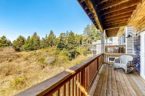 This relaxing home is the perfect choice for your next Oregon Coast getaway. This open and bright house boasts gorgeous wood trim throughout, lending a comforting and relaxing atmosphere. The wood stove in the main living area adds comfort, and guests can entertain themselves with the included telescope or full-size piano.
