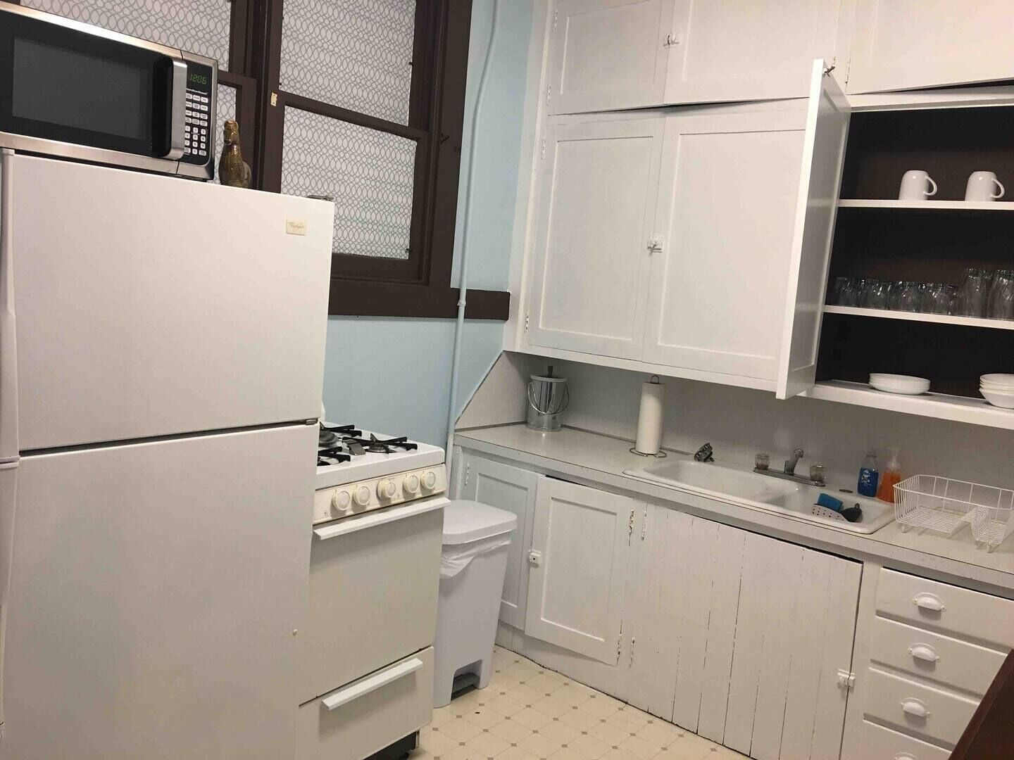 The spacious kitchen has the original cabinets from 1935 and the original inlaid linoleum. It is fully equipped with a full sized stove, full sized refrigerator, microwave, toaster and coffee pot.dishes. The kitchen has cookware, an assortment of dinnerware, from casual to bone china, flatware utensils and a supply of coffee. There is a cute little table for two for romantic dinners.