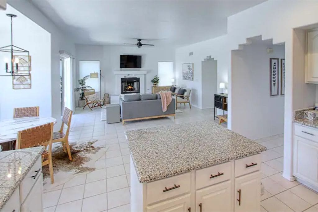 Located in a quiet neighborhood with unbeatable mountain views, this home offers four bedrooms and plenty of space for up to 8 guests. There are two living areas on the main floor that spill out into the backyard with a covered patio, plenty of seating, a pool and a firepit.