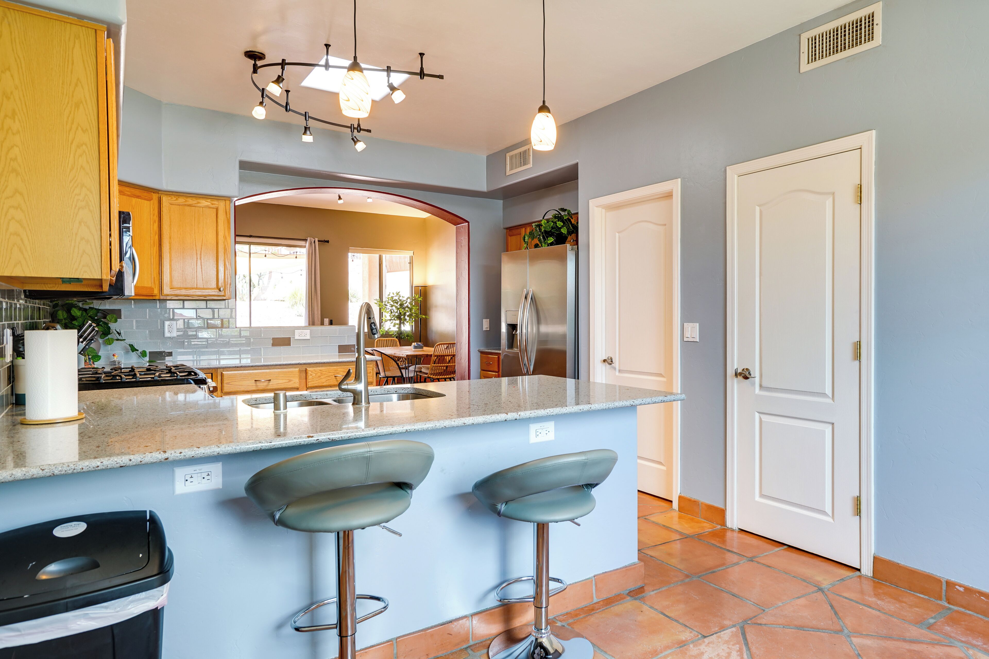 We have a charging station so you can enjoy the free Wi-fi and relax in the spacious living room with a flat screen TV. The kitchen is ready for you to brew some coffee or mix an afternoon margarita that you can savor on the balcony overlooking the heated pool and gorgeous Catalina Mountain views. We even have pool towels waiting for you!