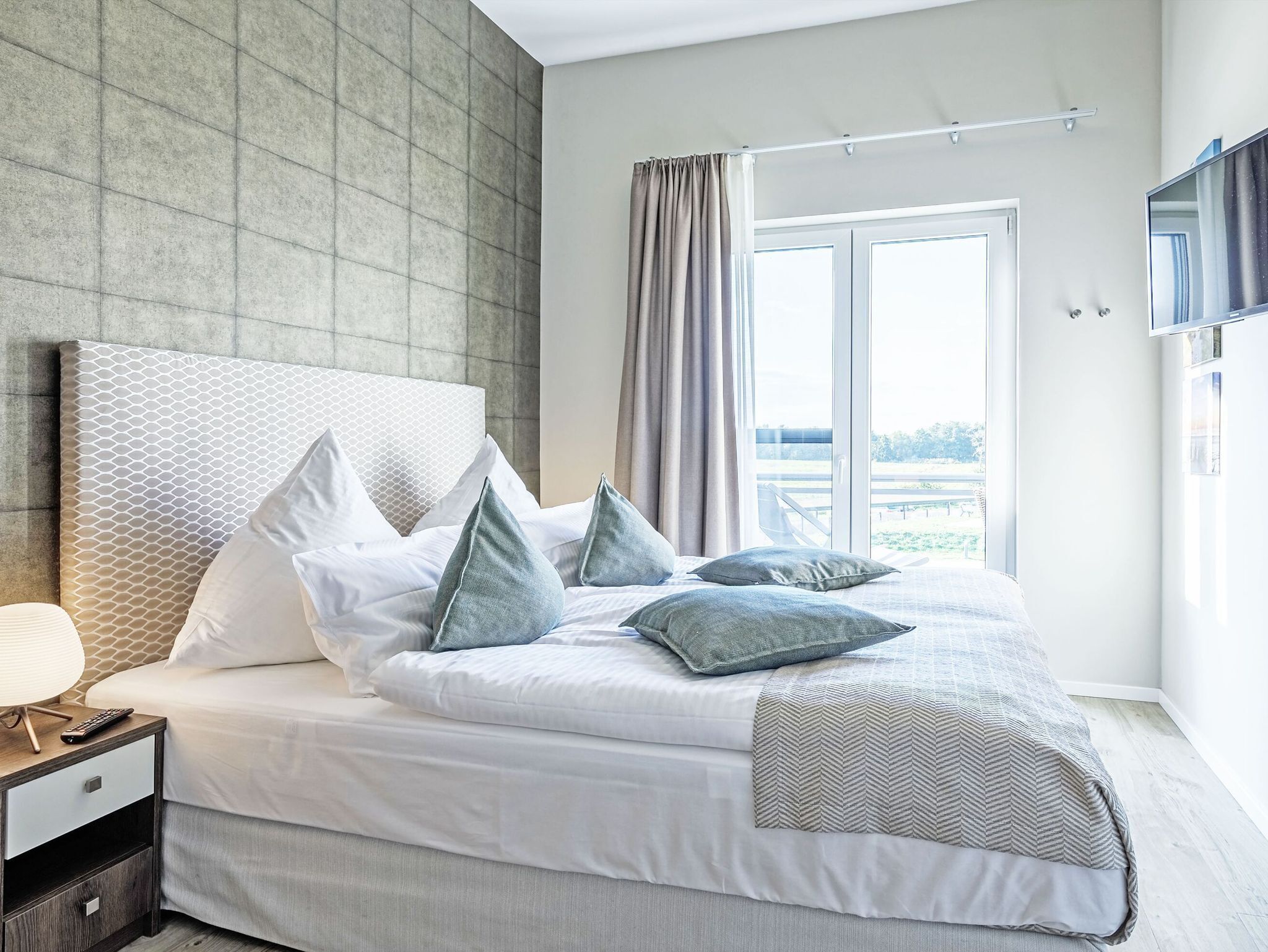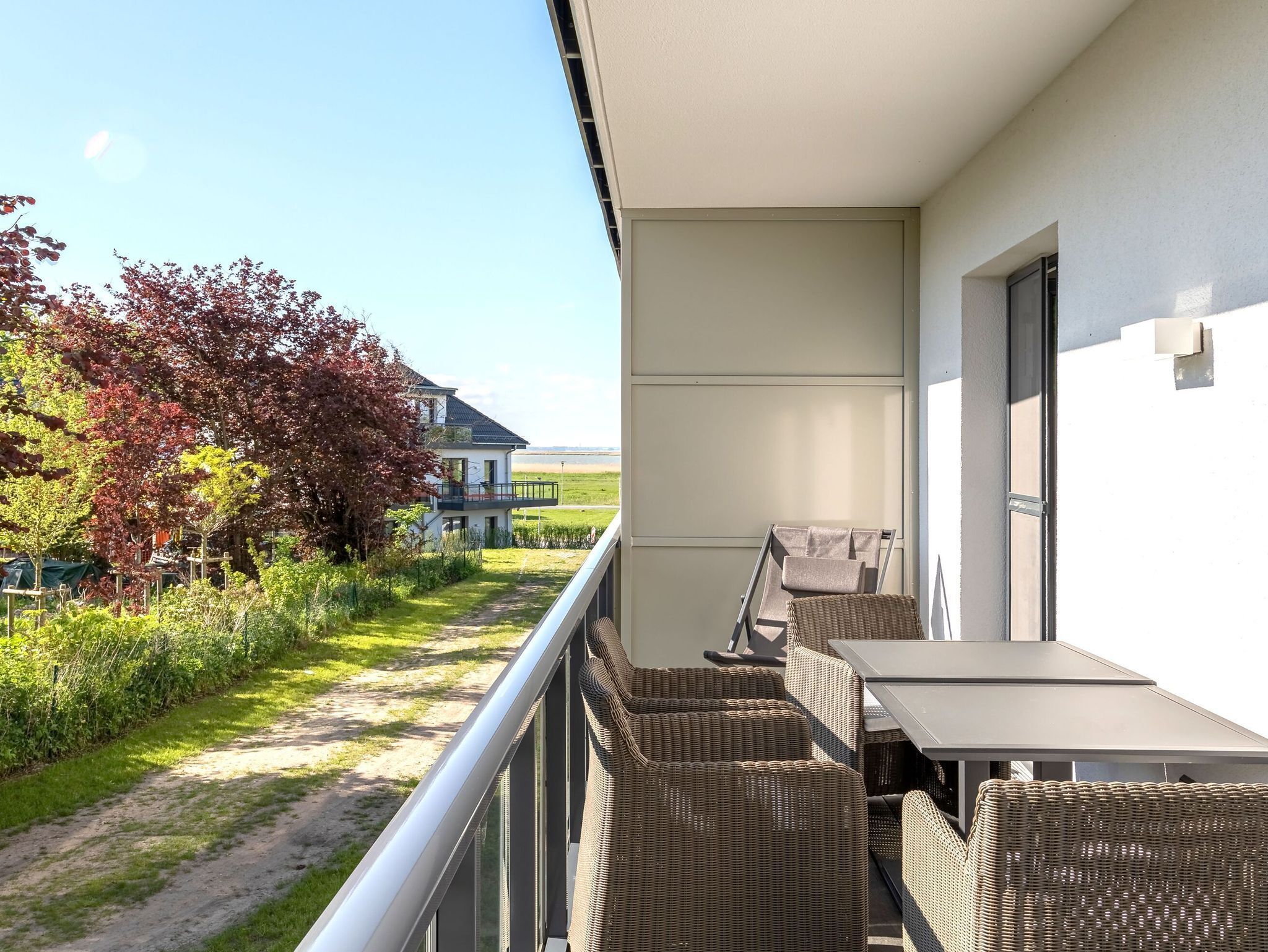 Enjoy your vacation in the modern beach lily apartment in the Baltic Sea resort of Wustrow. Experience relaxing days between the Baltic Sea and the Bodden. The non-smoking apartment is located on the ground floor of the listed main building of the newly built holiday complex Zwei Wasser - Seefahrtschule Ostseebad Wustrow. The 3-room apartment has a modern beach house style and inspires with three floor-to-ceiling windows and a view of the bay. The high ceilings underline the spacious ambience of the apartment. On the spacious south-facing terrace, which is accessible from both the living and dining area of the apartment and the bedroom, you can let your gaze wander over the Saaler Bodden with its boats and sailing ships. The terrace is equipped with a table with 4 comfortable patio chairs. From the living room and the adjoining bedroom, you reach the terrace, where you can end the day comfortably with a glass of wine. The open, well-equipped kitchen area has an induction cooker with four hobs, an oven, dishwasher and a refrigerator with freezer. In addition, the bright fitted kitchen is equipped with numerous cooking accessories and invites you to linger and cook together with a large dining table and five comfortable chairs. Seat shell chairs in a timeless gray provide comfortable seating in the open dining and living area. A large dining table can accommodate four people. The design floor covering laid throughout the living and sleeping area of the apartment has a simple and subtle effect. With its cozy sofa and armchair, the living area invites you to spend pleasant moments with family or friends. The media technology is up to date. They have two flat-screen TVs and free WiFi. A safe for your valuables is available in the apartment. The furniture in the two bedrooms is very modern. A wardrobe, 2 bedside tables with bedside lamps fit into the harmonious ambience of the bedrooms. The modern box spring beds with a mattress size of 180 cm x 200 cm (2 x 90 cm x 200 cm) invite you to dream. Right next to the one bedroom you have a separate dressing room. The second bedroom is a captain's bedroom and is very conveniently separated from the living area by a sliding door. The two bathrooms are stylishly furnished with modern tiles and each have a walk-in shower, a large vanity, and a towel radiator. There is also a bathtub in a bathroom. After a long walk on the beach, a relaxing bath is just the thing. In one of the bathrooms there is a separate lockable toilet with an additional washstand and a towel radiator. The harmoniously coordinated furniture in the style of a beach house, the murals and home accessories let you quickly calm down and make your vacation a special experience. You and your accompanying guests can use the in-house fitness and wellness area. In a fitness room with modern sports equipment, you have the opportunity to keep fit even on vacation. Then you can relax in one of the two saunas with adventure showers and relaxation room. The beach of the Baltic Sea is only 600m away. There you can relax and enjoy long walks. A bicycle storage room is available for our cyclists directly at the house. You can book a carport parking space on the premises for this apartment for a fee for your stay. Please note that these are visualized images for the time being, as the apartment is still being completed.