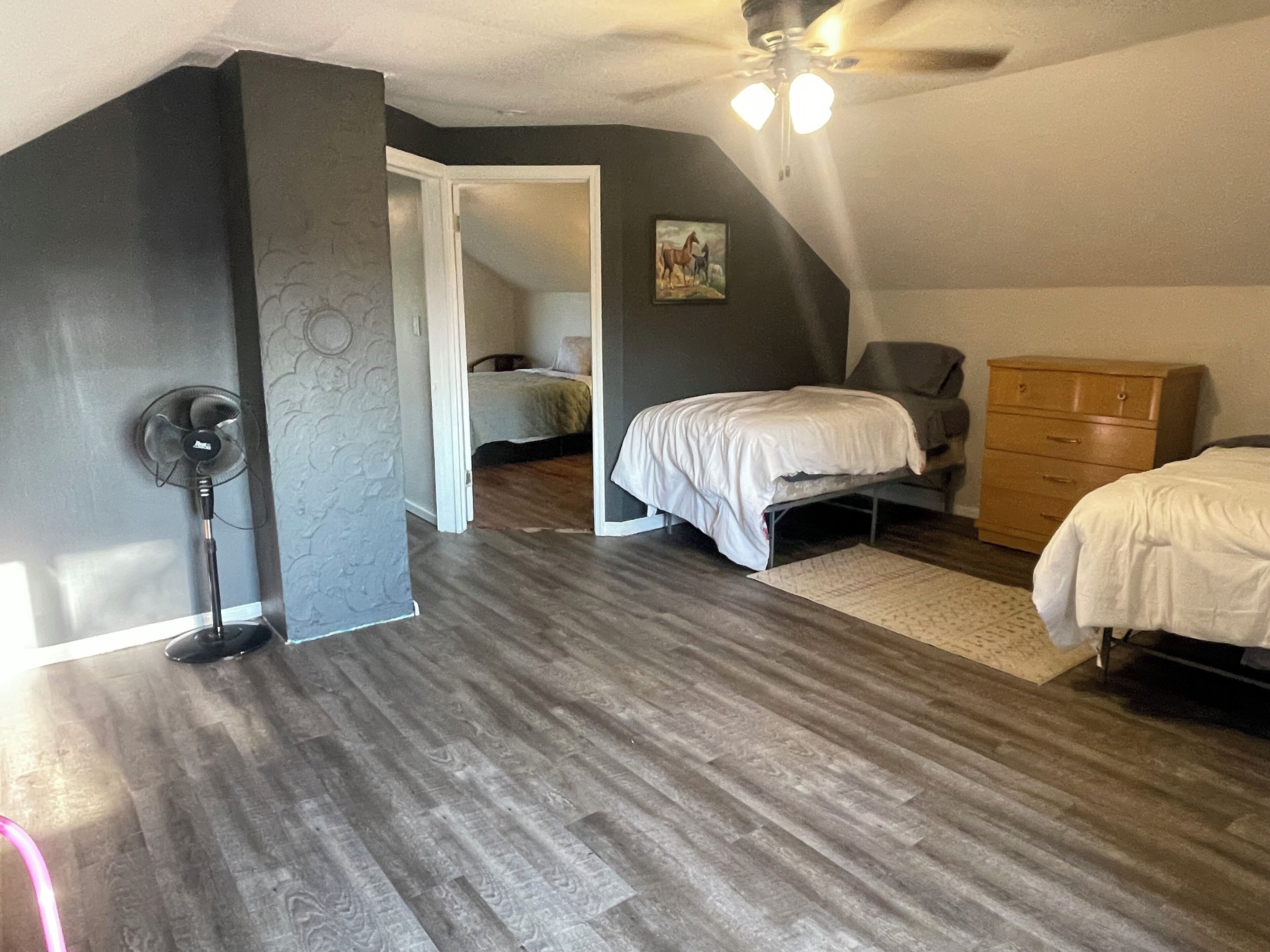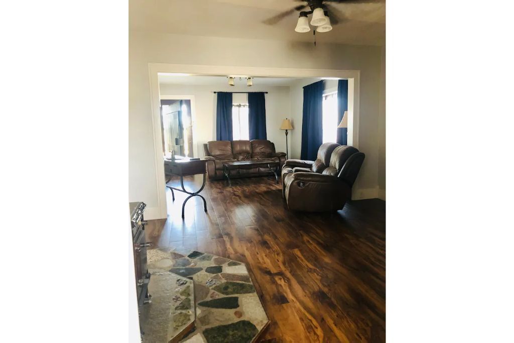 The kitchen is newly remodeled and offers all of the modern amenities you will need for your stay. Bedroom 1 has a queen bed and a large closet with plenty of space for all of your luggage. Bedroom 2 offers full sized bed, a closet, and a desk for your business needs. The living room has a twin futon, twin air mattress, and a couch for extra sleeping spaces. The freshly remodeled bathroom is spacious and clean. The laundry space offers a full sized washer and dryer along with a ironing board. Wifi and a large TV with streaming services will keep you entertained.