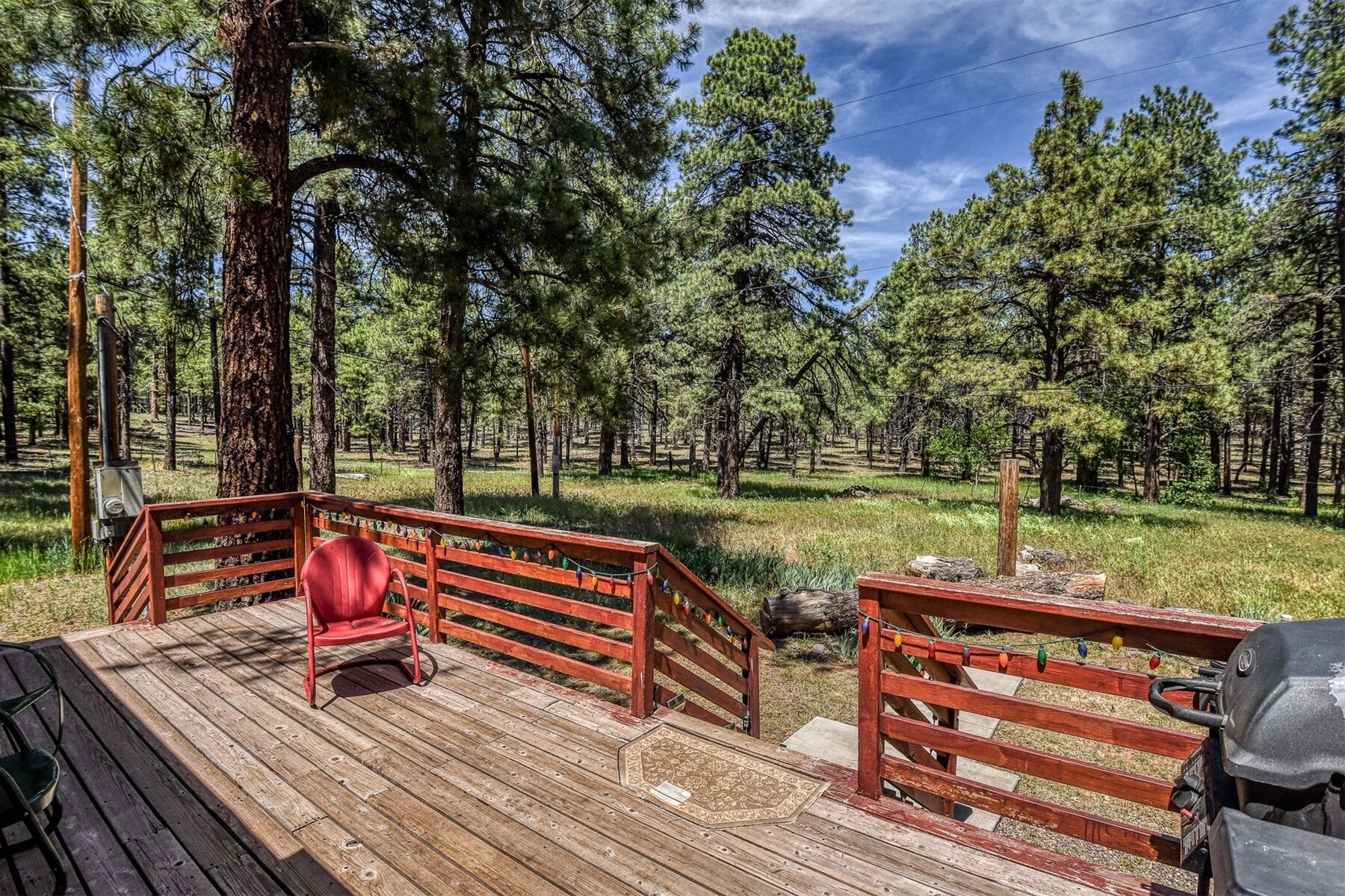 Outside the Cabin: If you love seclusion and views of hundreds of pine trees, this is the cabin for you! The large wraparound deck is great for outdoor family meals. Then relax with some marshmallows around the campfire or watch the swaying trees or bright stars as you lay in the hammock. Or enjoy the propane fire pit watching the stars from the back deck. A propane Weber grill is also located on the back deck. Children will love the tree house with slide and hammock, swing sets, and horseshoes. There is a huge selection of board games, videos and DVDs as well as 4 TVs. Nearby hiking and off-roading trails abound. The Grand Canyon Deer Farm/Petting Zoo and Oak Hill Snowplay area (in winter), and Bearizona are only minutes away. There are several small lakes nearby, as well as the Lava Cave and breath-taking Sycamore Canyon hiking/rock climbing area. The area around our cabin is abundant with elk.