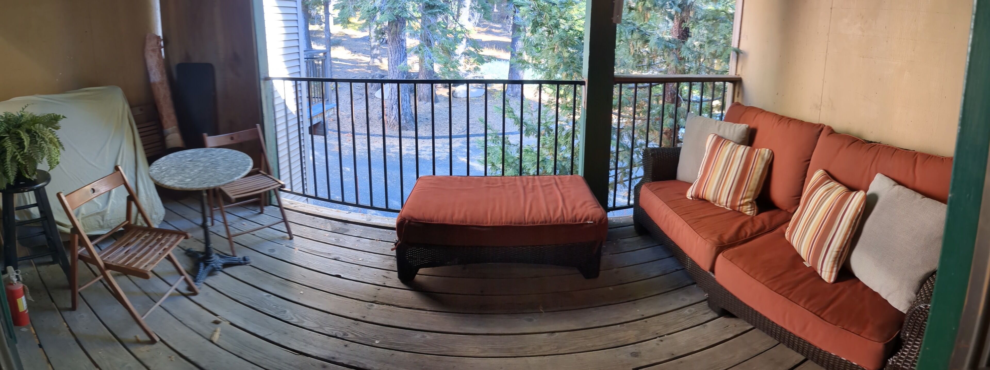 This cabin has a partially covered deck lounge sofa, outdoor propane fire pit. There is a beautiful redwood bar table along the deck railing to let you enjoy the river view while having your meals or just a coffee!