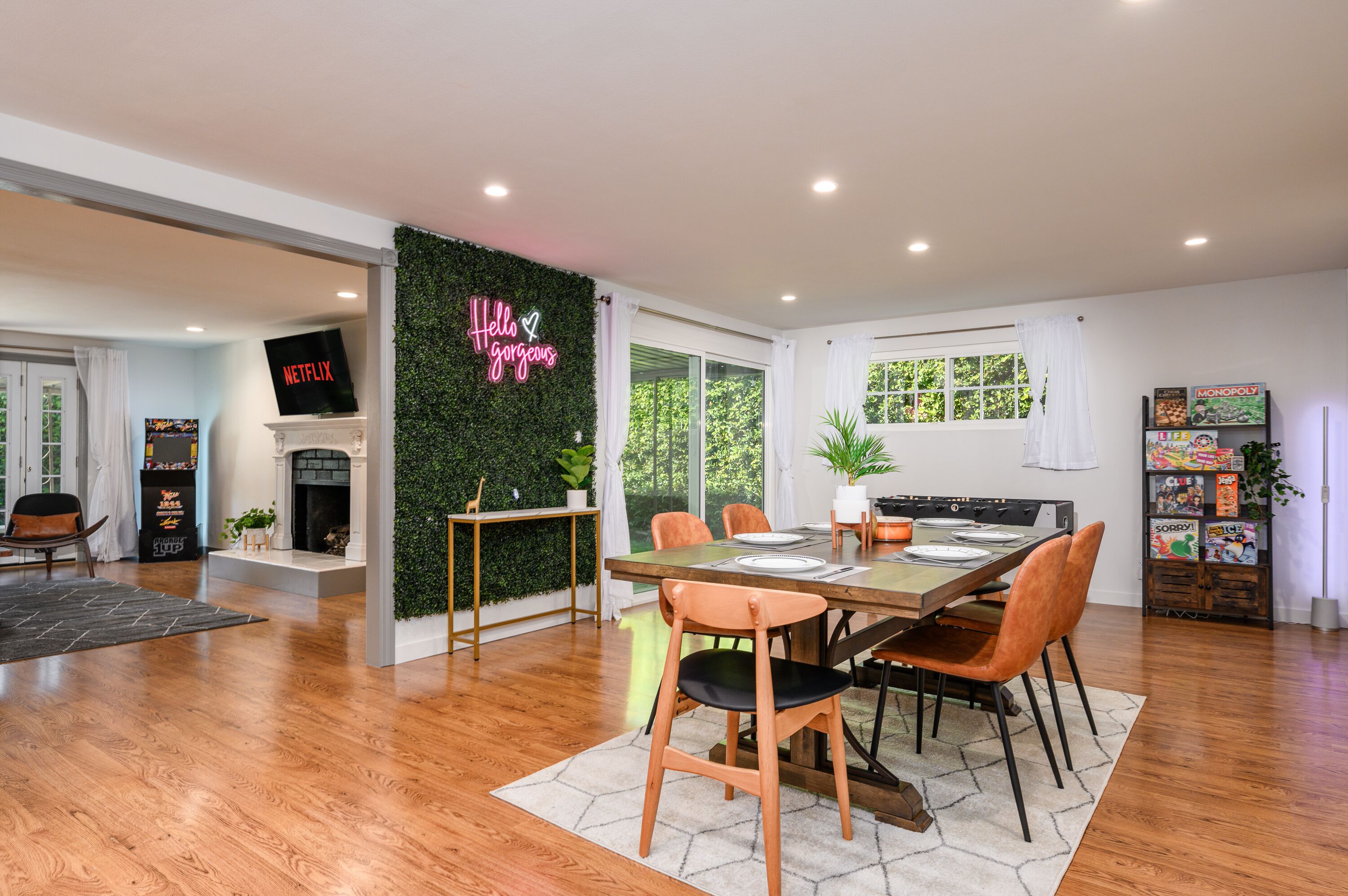 Escape to your own private oasis featuring a heated pool, ambient electric fireplace, sizzling BBQ grill, and a billiards table for nonstop entertainment. Perfect for families, friends, or couples, this sun-filled retreat offers cozy interiors, a fully stocked kitchen, fast WiFi, and smart TV. Lounge by the pool, dine under the stars, and create unforgettable moments in total comfort and style.