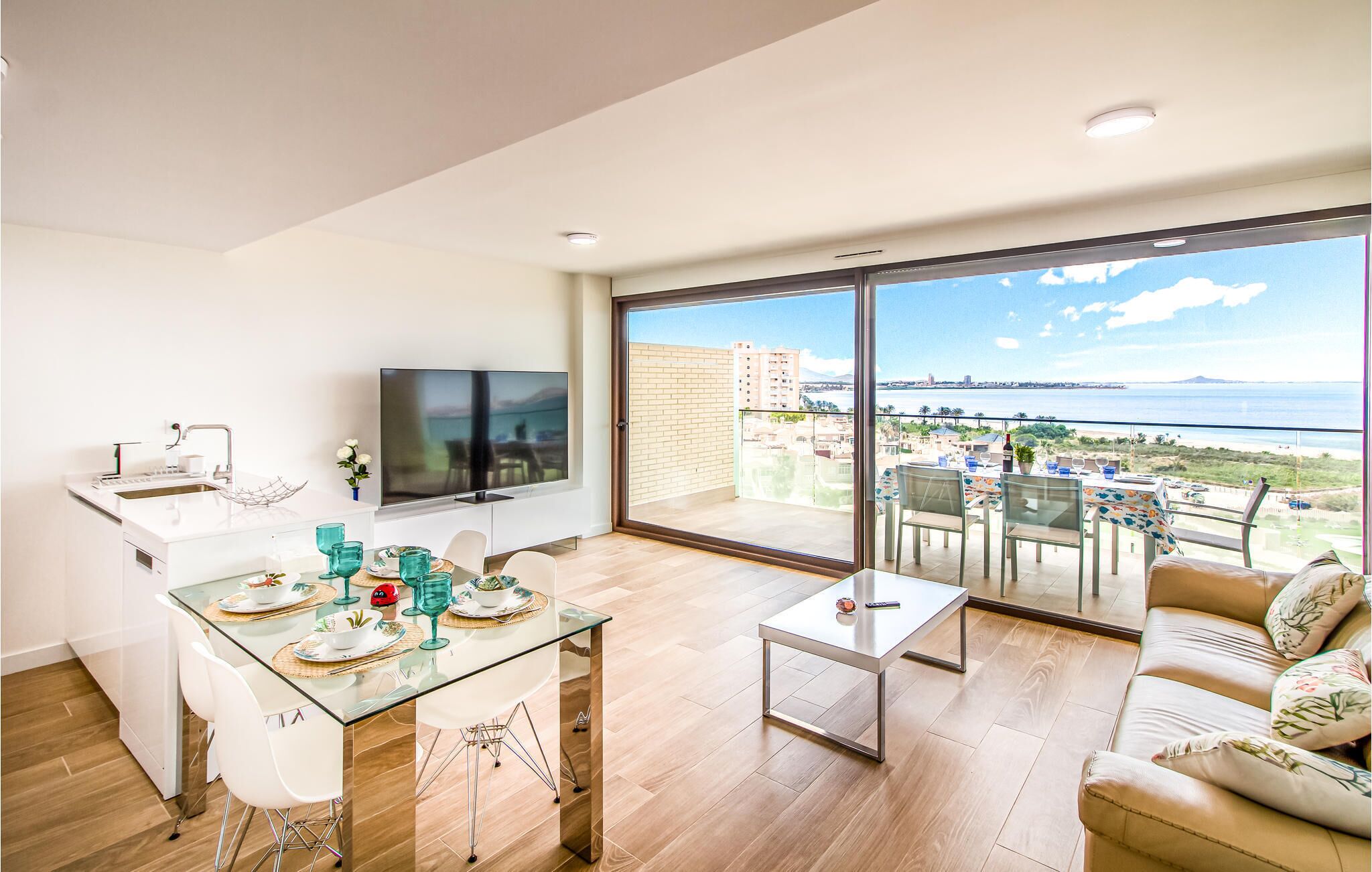This lovely apartment is perfect for families or a small group of friends. It's a 9th floor front line to the Mar Menor, so it has amazing views over the sea, the Salinas and La Manga from all the rooms.
