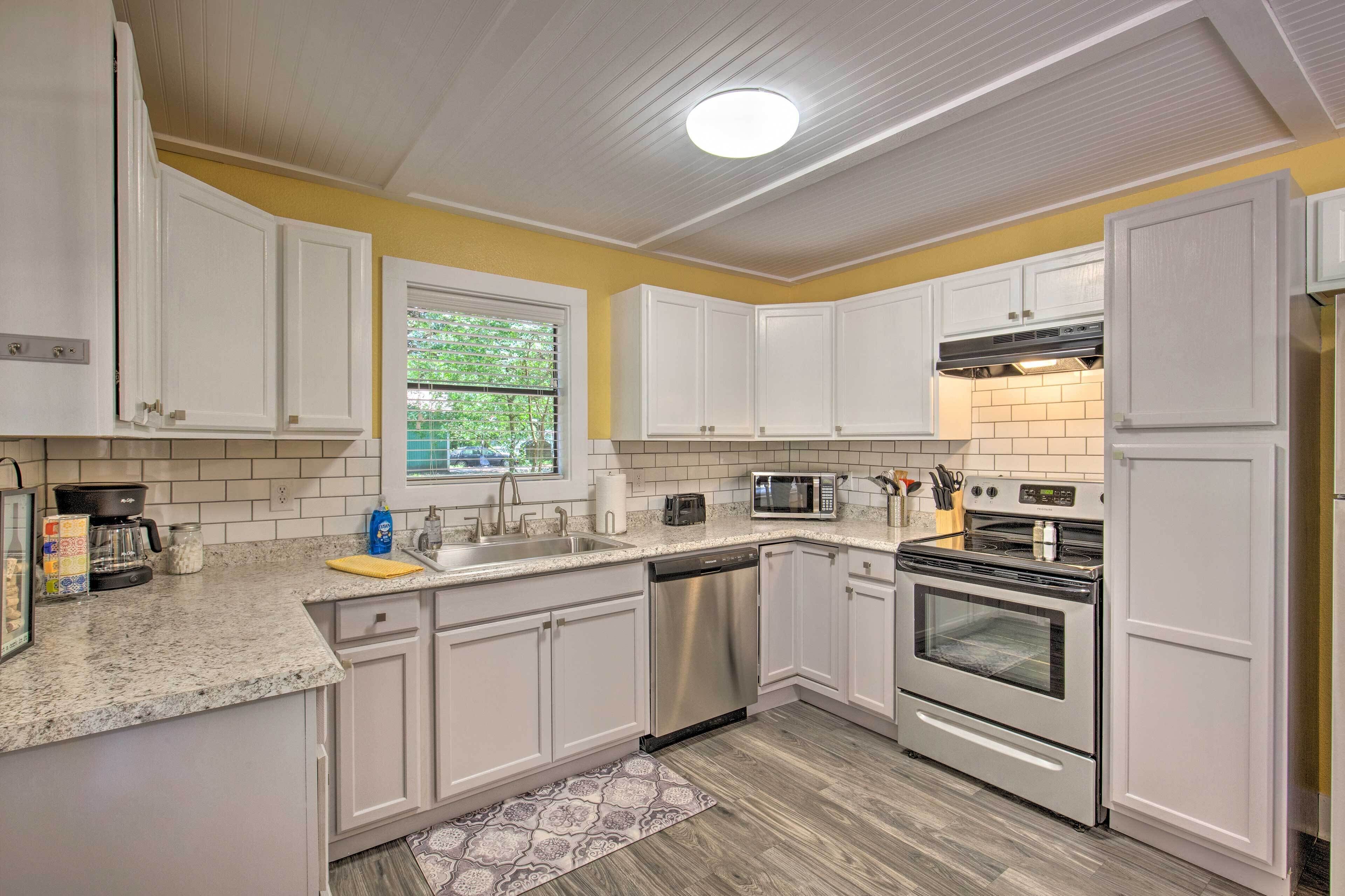 The kitchen, though small, is perfectly equipped for your culinary needs, featuring a large electric skillet, fridge, microwave, and all the essentials to prepare simple, delicious meals. Start your day with a cup of complimentary coffee, tea, or cocoa, brewed with the single-serve coffee maker and coffee pods provided. For more adventurous cooking, step outside to the back deck, where you can fire up the electric grill to expand your options and savor a meal under the open sky.