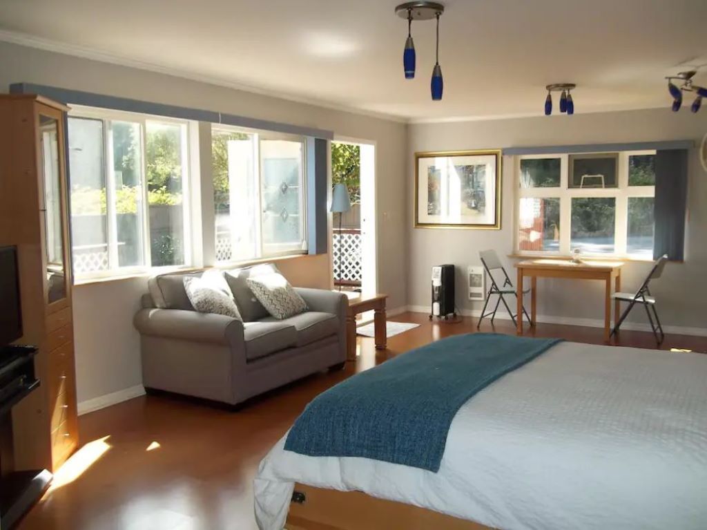 Cozy suite , bright and welcoming, 3 blocks from the ocean, close to all restaurants and shopping. Enjoy and relax , just bring your toothbrush. Private off street parking in quiet neighborhood. The kitchen is well equipped for light cooking, coffee maker, toaster... kitchenette with convection microwave, sink 2 burners and small fridge. There is a freezer available for your use and a coin-op laundry room on the property. You'll have a private entrance with patio and BBQ. The bedroom is complete with quality linens, a Queen size bed with TV. full spacious bathroom with tub & shower, towels are provided.