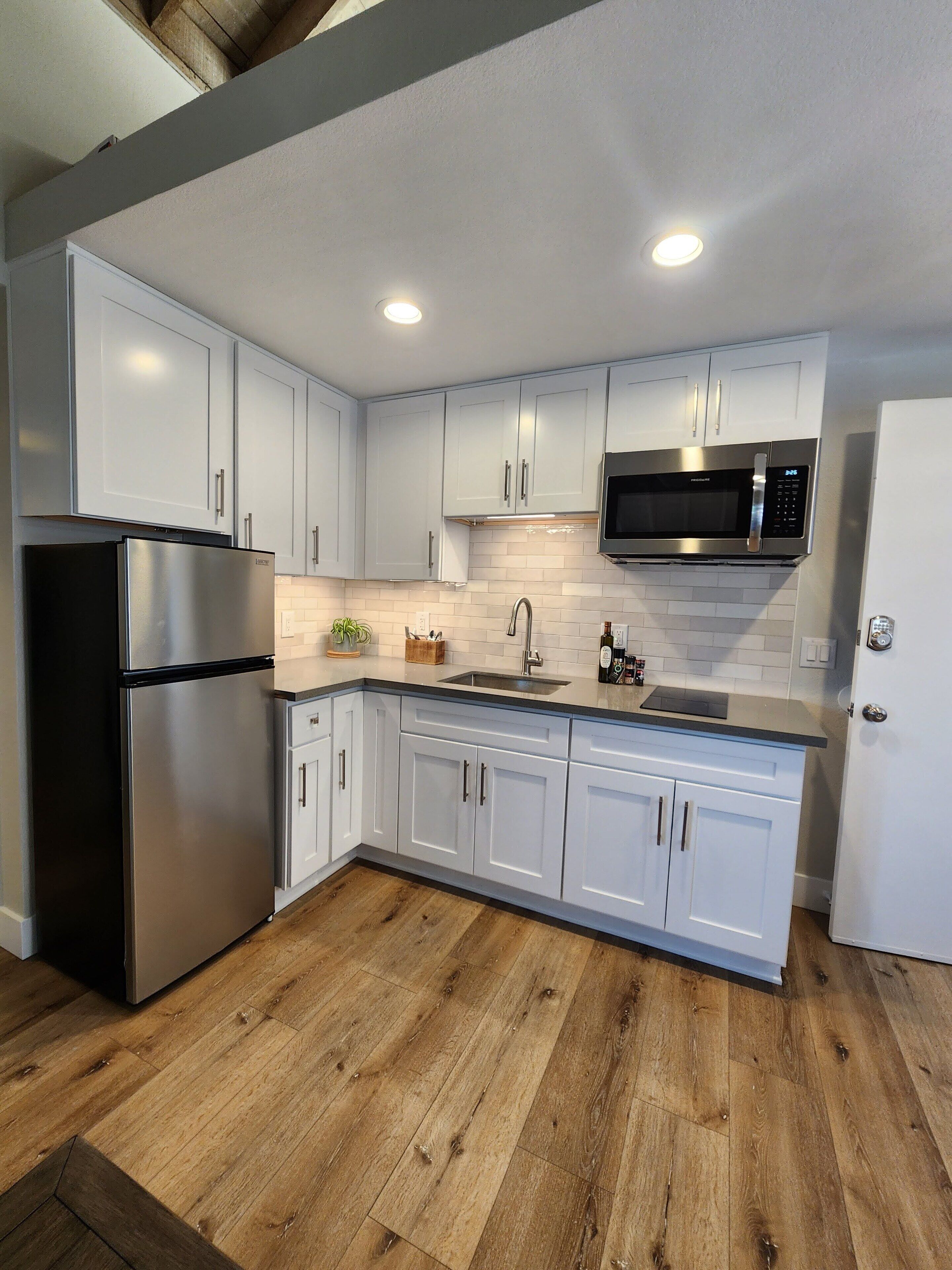 Included in the unit are blazing fast WiFi, a Roku TV, a small fridge and freezer, microwave, a single burner stovetop, and a coffeemaker. There is also a fold out workspace/dining table, Everything you need. (Please note: There is no couch or kitchen sink, a bathroom sink.)