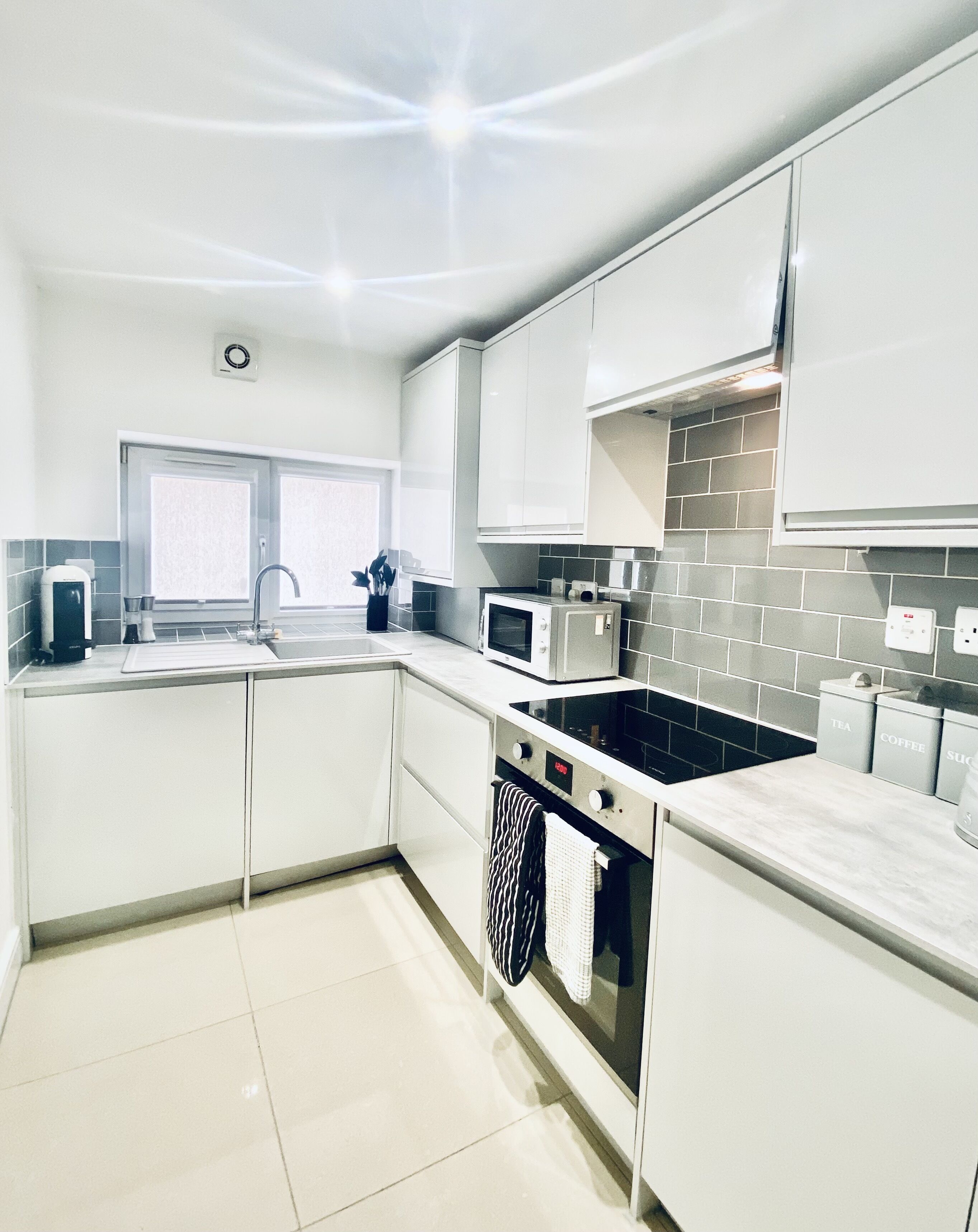 The apartment has a modern kitchen which is fully equipped with everything you could need to prepare meals. There is also the added bonus of a Nespresso Vertuo coffee machine.