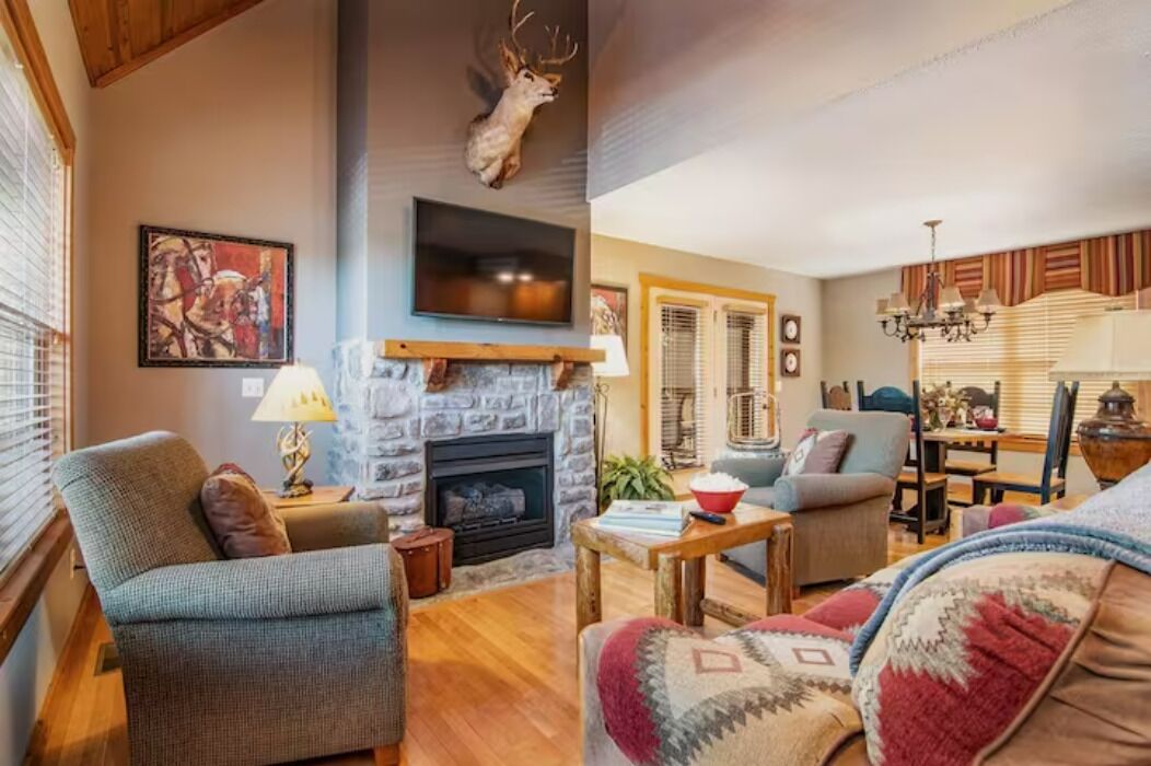 This two bedroom lodge features a king-size bed in each bedroom with a private bath that includes a large whirlpool tub and separate shower. There is a fully equipped kitchen, dining room, washer/dryer and a large screened-in deck. The living room includes a sleeper sofa, fireplace, wireless internet and cable TV.
