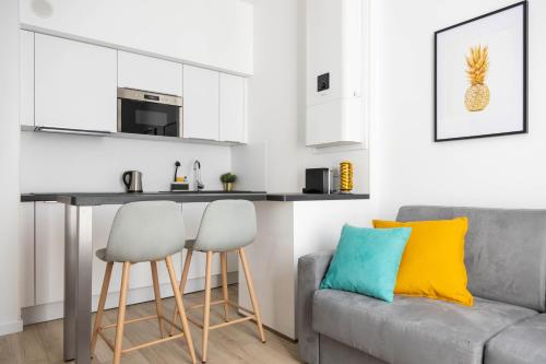 The apartment features a spacious living room with a fireplace, comfortable sofa, and armchairs. The kitchen is very well-equipped: dishwasher, convection oven, microwave, induction cooktop, refrigerator, kettle, Nespresso coffee machine...