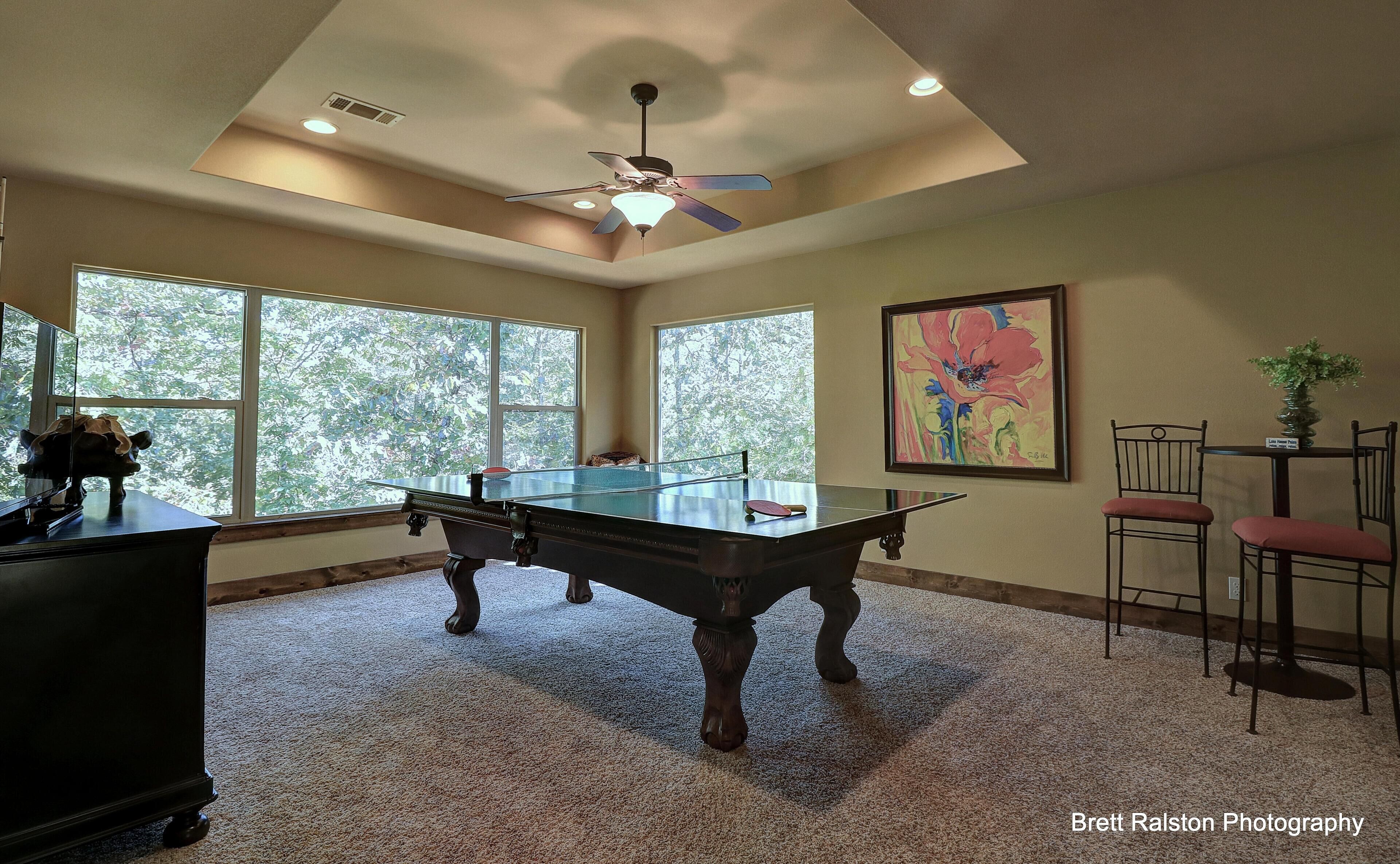The downstairs living area has a regulation pool table, small air hockey table, flat screen TV with DVR, and double sliding doors out to the deck.
