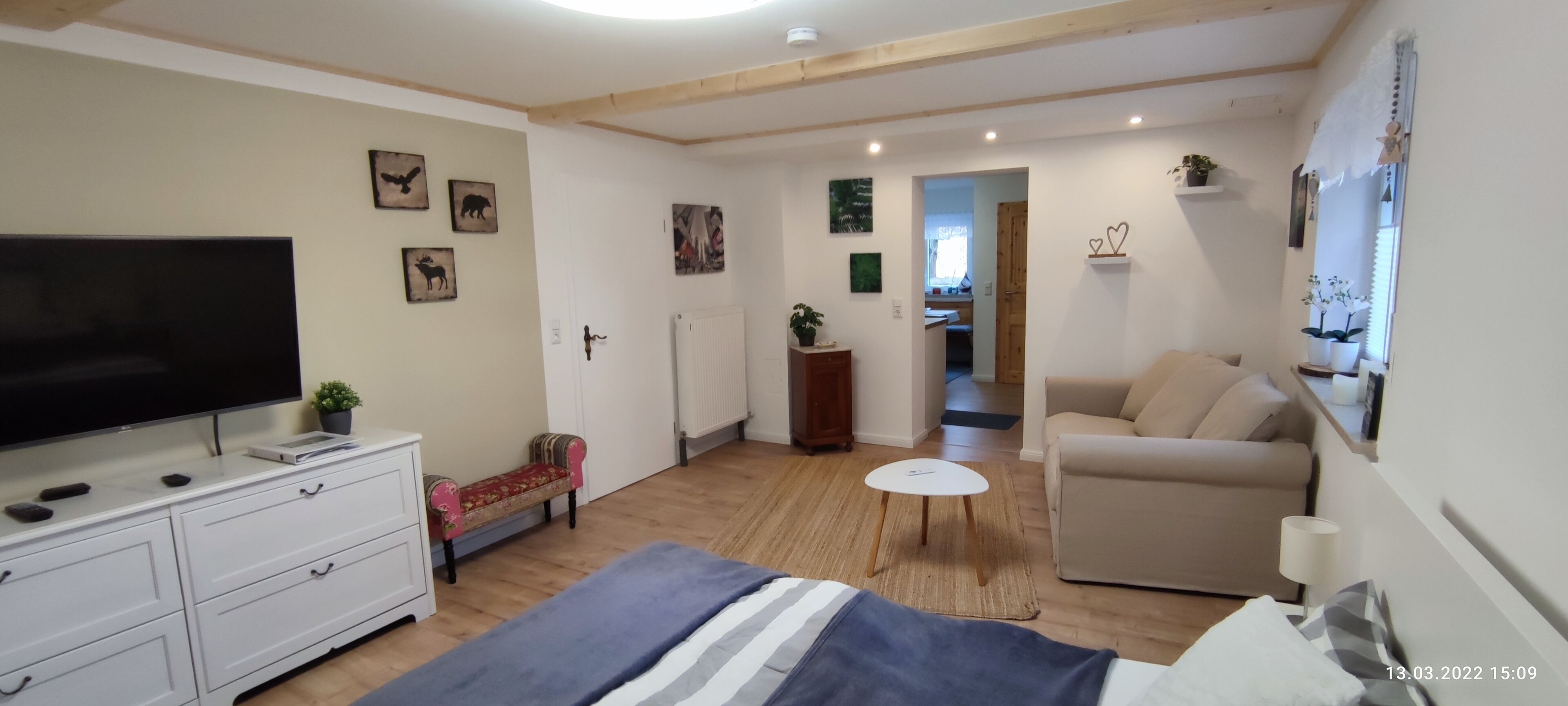 When occupied by two people, the flat is classified as a **** holiday flat. From the eat-in kitchen you have a view across our garden into the Rednitz valley. There is a kitchen-cum-living room (with optional sleeping facilities for two people), a bedroom and a bathroom with shower, bathtub, two washbasins and separate WC. One window in both the bedroom and the living room is fitted with an insect screen. The living area is approx. 70 m². Two satellite TVs, DVD player, WLAN and workstation complete the facilities.