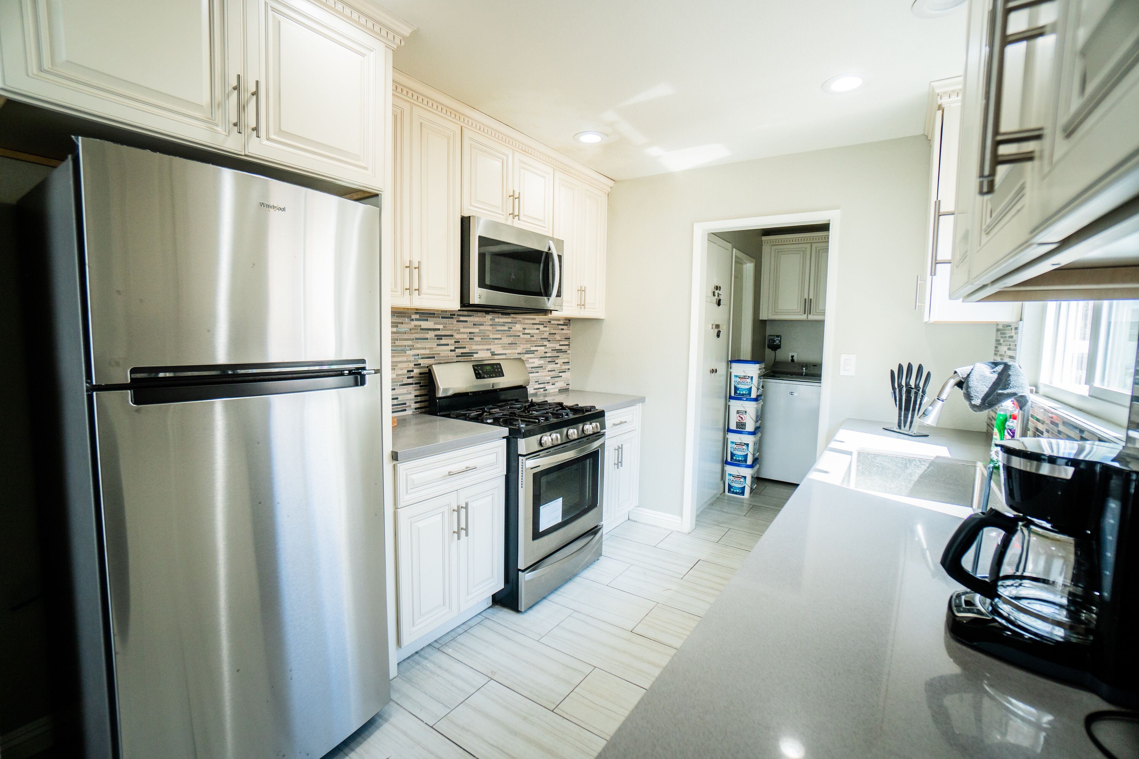 The kitchen comes fully equipped with everything you would need to cook up all your favorite meals, from the stove, to the microwave, to the spacious fridge/freezer.