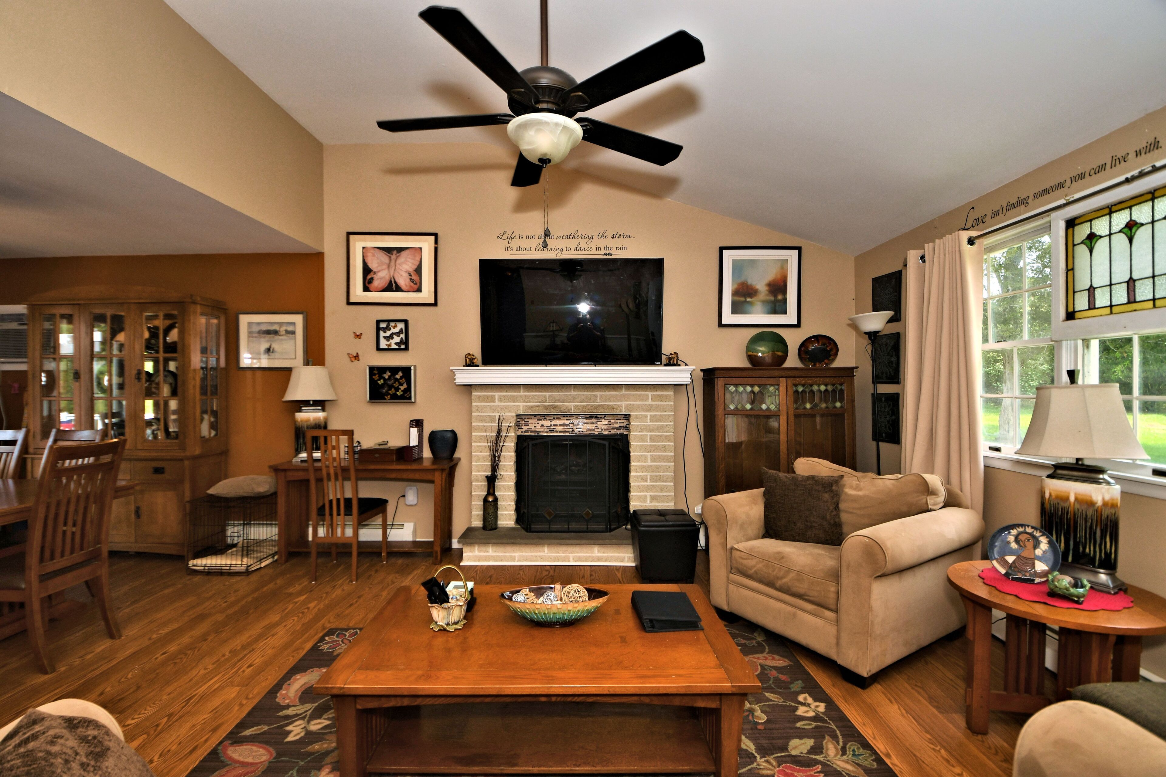 There is a Cathedral ceiling living room with a brick remote controlled electric fireplace. A Large Flat Screen TV is mounted above. No cable but there is WIFI and streaming.