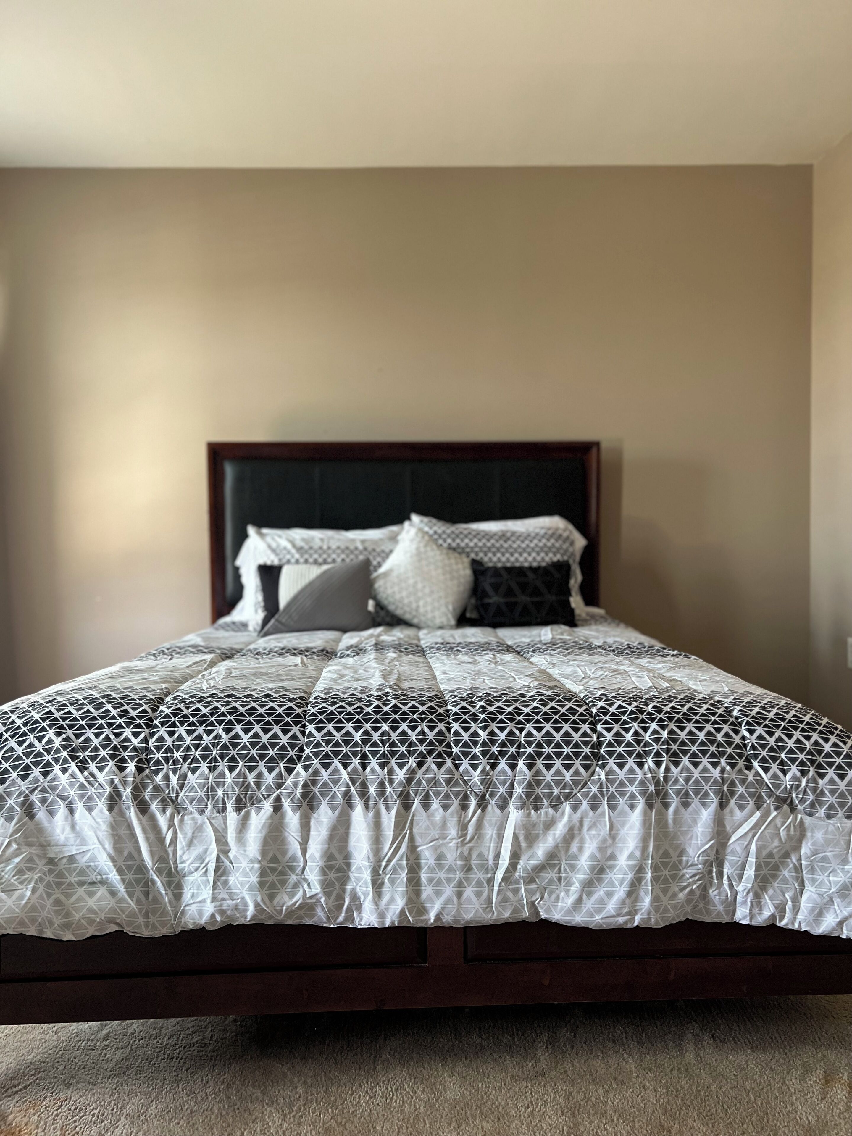 Bedroom #3 has a queen bed with all new bedding, as well as a dedicated workspace with a comfy chair. There is a dresser to store clothes and a long mirror. You’ll also find a FULL bathroom attached with a pedestal sink and standard shower stall. You’ll also have an LG front-load washer & dryer tower for laundry.