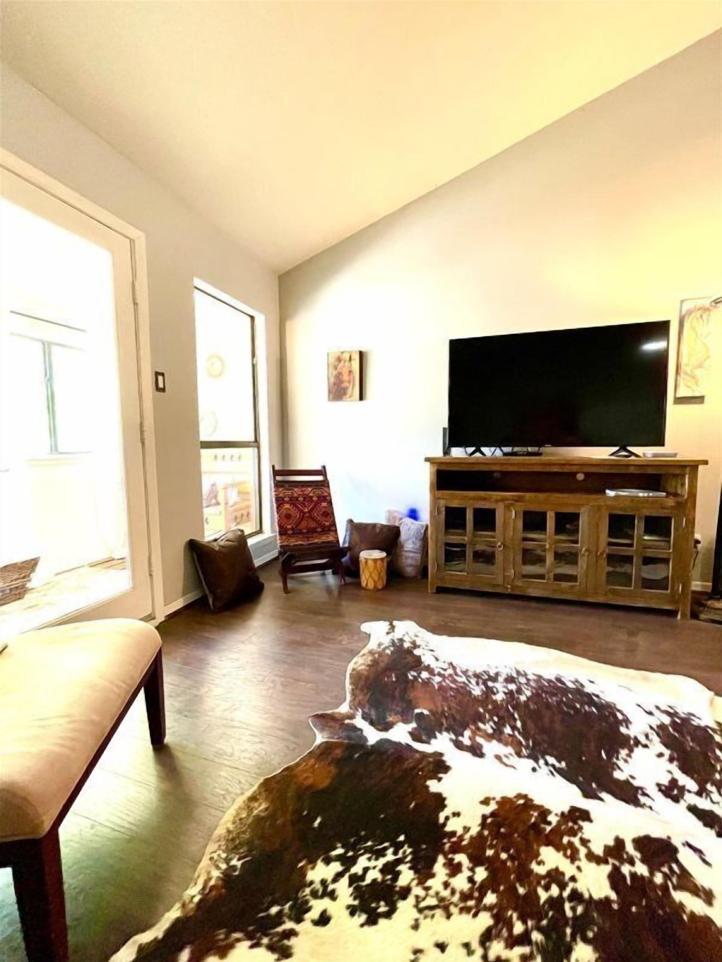 Welcome to Bluebird View, where stunning Sierra Blanca vistas await! This charming 2-bedroom, 1100 sq. ft. home offers the perfect mountain retreat with modern comforts. Step into the warm, inviting living area, complete with a cozy gas fireplace and stream your favorite TV shows with seating for everyone to gather and unwind. The hardwood floors throughout add a rustic touch, balancing beautifully with the home's contemporary style.