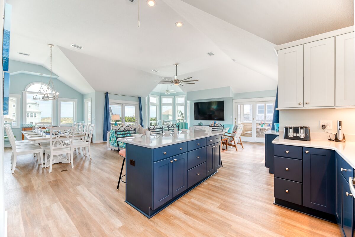The mid level offers 4 king en suites, each thoughtfully furnished and providing covered deck access. Ascend to the bright and airy top level, featuring a great room for ultimate relaxation and an 85" TV for catching up on your favorite shows. The newly-updated, open kitchen is a chef's dream, equipped with stainless steel appliances, two dishwashers, and bar seating for 4. The dining area offers plenty of room for family meals, as well as a round table and seating for 4 with ocean views. A half bath and a king en suite complete the interior of this level. The screened-in porch, with a picnic table, is the perfect setting for nightly card games or casual family gatherings with cool drinks. Step out onto the deck for ocean views and unforgettable sunrises. Experience the epitome of coastal living at We Love The Beach!