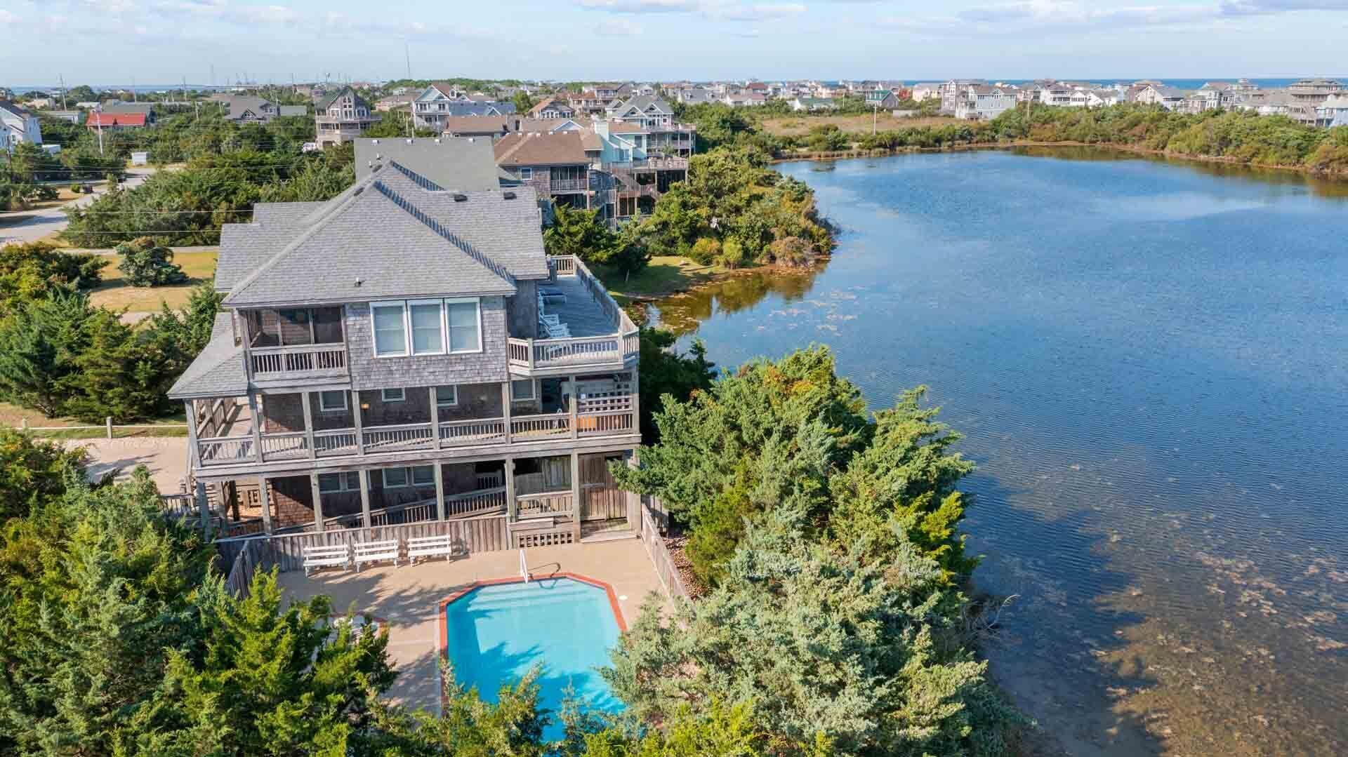OCEANVIEW Waves - Sea Vista Ct. - Relax and enjoy peace at STILLWATERS. This lakefront home with an ocean view offers rejuvenation from its two levels of decks, soothing hot tub, and sparkling private swimming pool. Easily embark on a STILLWATER adventure in your kayak or paddle board or try your hand at fishing with lake access right outside your back door. Conveniently walk to the community tennis and basketball courts or stay at home and play a game of pool in the first level game room – complete with a mini-refrigerator. Choose from five bedrooms, each with private entrance into a full bathroom. Two bedrooms on the mid-level, one with a queen and one with two sets of twin bunks, share a full bathroom. The other three bedrooms, two with a queen and one with two singles, have private full master bathrooms. All three queen bedrooms have slider entry to the lakefront decks. The spacious great room with mesmerizing blue water views offers plenty of seating around the large flat screen TV. The well-appointed kitchen has everything the chef will need to prepare culinary delights with an accompanying eight seat dining table and two seat at the kitchen bar. Retreat to the screened-in porch off the kitchen for an evening game with loved ones or simply take in the sunrise over the sea or the sunset over the lake from one of the wrap-around decks. Book your stay today and head to STILLWATERS to restore your soul. (Fireplace in photos is not for guest use).