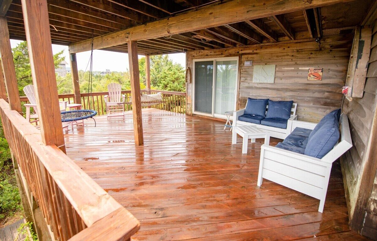 Lost at Sea has three decks with the rooftop deck offering spectacular views of sunrises over the ocean and sunsets over the sound. The screened in deck is a great place to enjoy the shade and have an outdoor meal or enjoy the rocking chairs while watching the sun set over the sound; and finally the sliding doors in the living room and bedroom lead out to the main deck for outdoor enjoyment. There are beach chairs, umbrellas, sand & water toys, games, movies and more. An outdoor picnic BBQ in the backyard is casual and fun for dinner and the outdoor shower is great to wash off the sand from a day at the beach or sound.