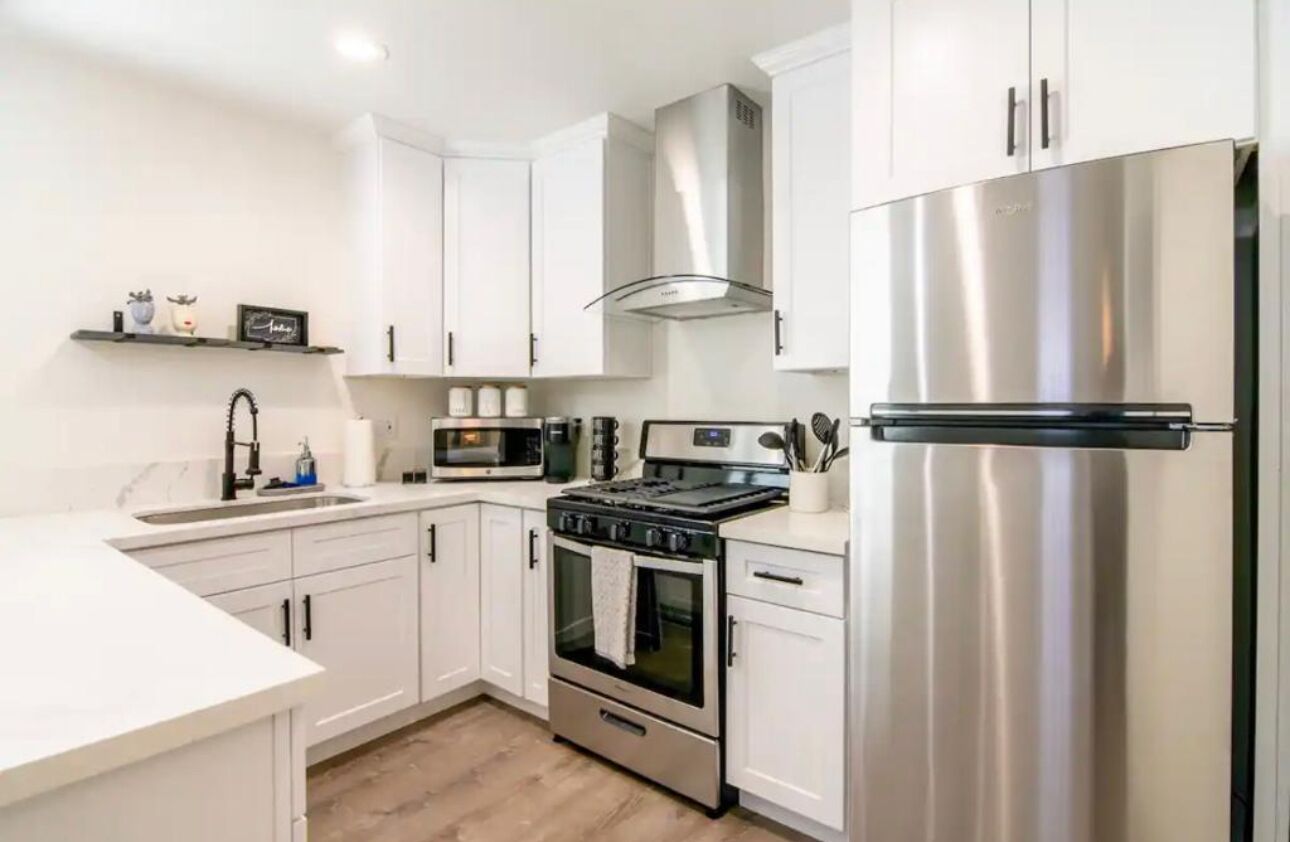 A fully equipped kitchen with all the essentials, including a refrigerator, stove, microwave, coffee maker, and cookware, so you can prepare your favorite meals with ease.