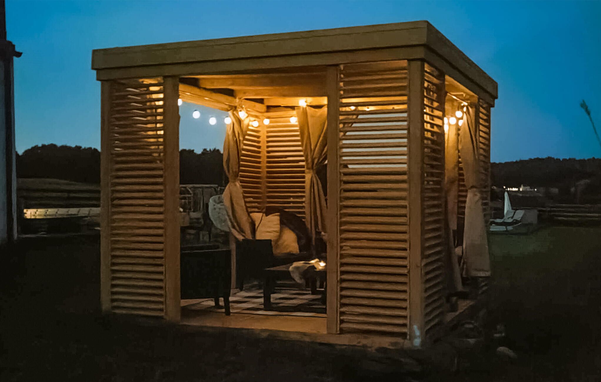 In the house are 4 bedrooms, 2 and a half bathrooms, a big living room with a fireplace and a projector for the movie nights. Our favorite place on this house is “winter garden” from which you can see beautiful view on the lake. Perfect for breakfast or dinner!