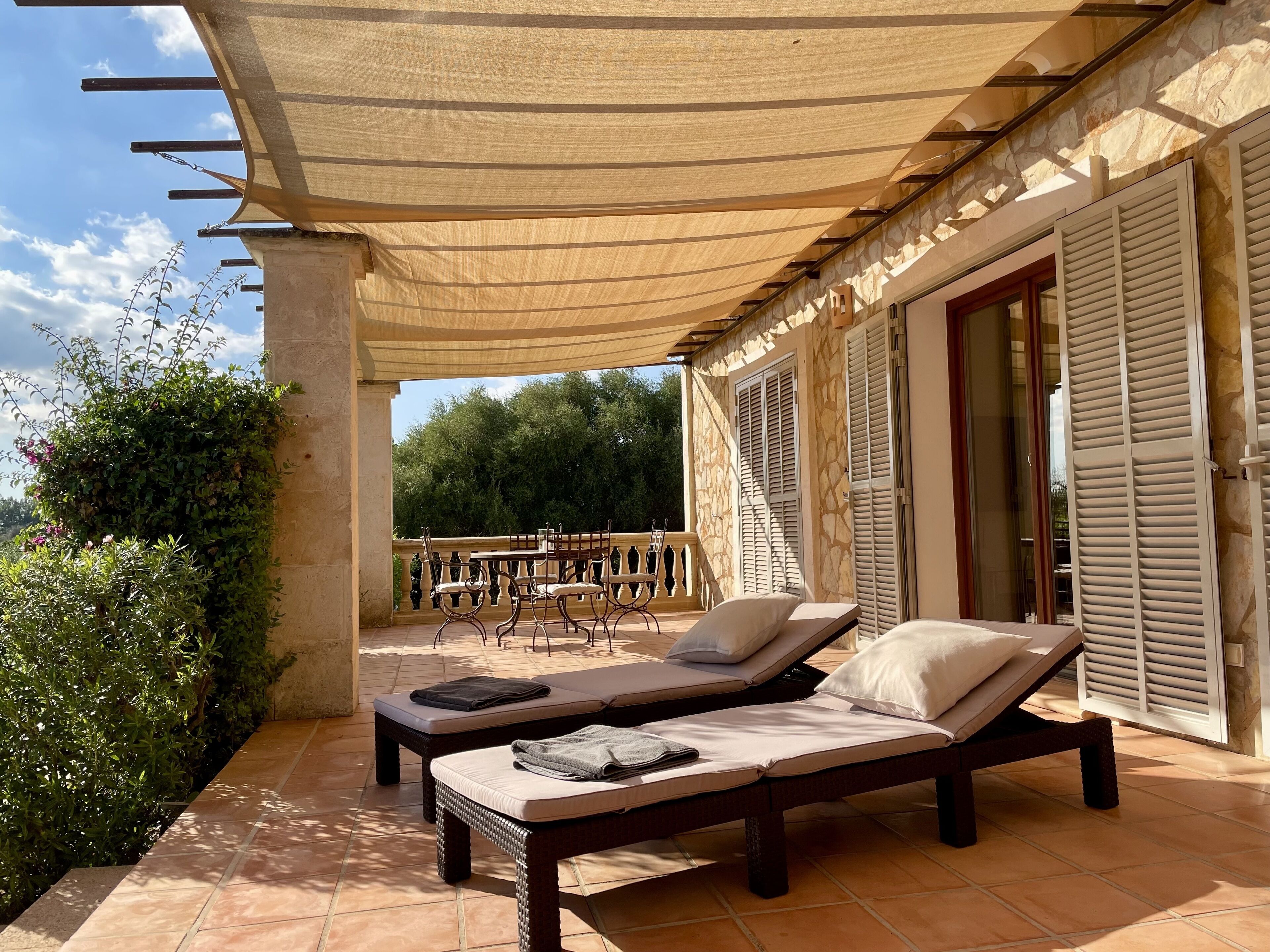 On several large terraces around the house everyone can find their corner in the shade or in the sun. The property is situated so that you can enjoy sunshine from early morning until sunset. All rooms have access to the terraces.