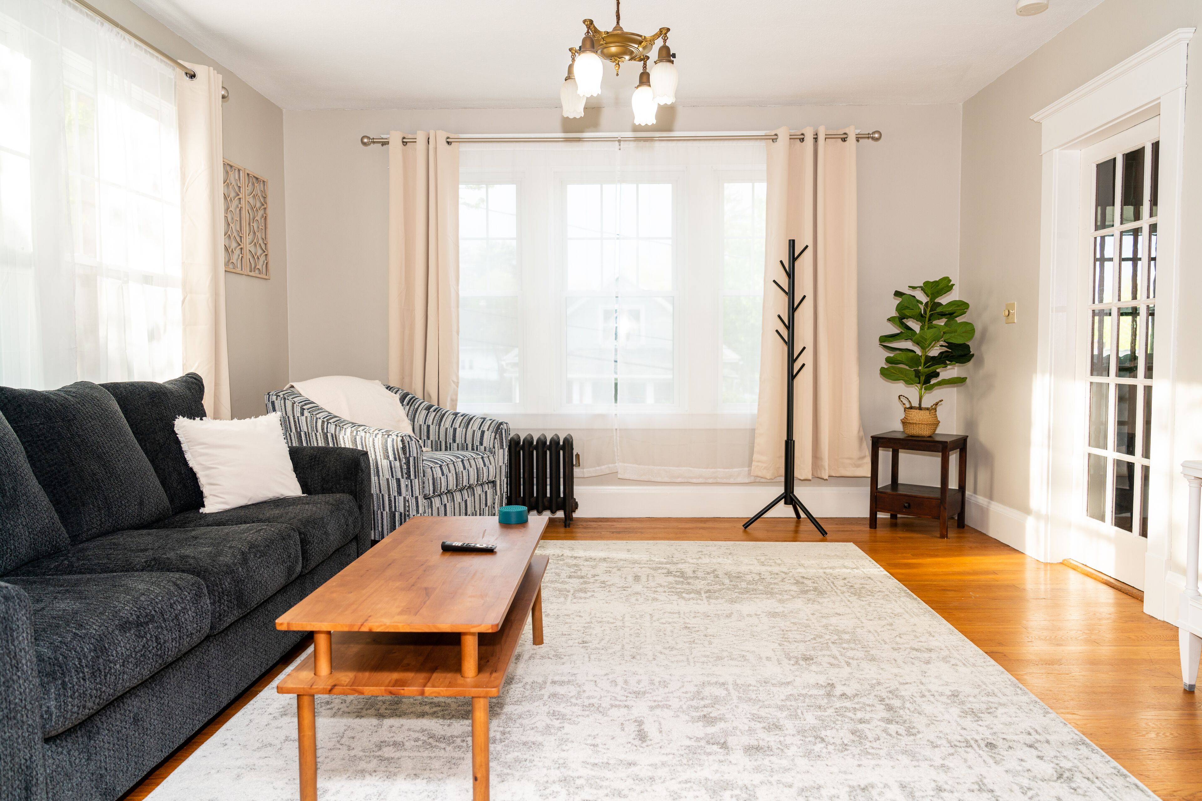Inside, you’ll find tasteful, modern furnishings that complement the warm hardwood floors throughout. Large windows fill the apartment with natural light. Each bedroom offers a cozy retreat with comfortable beds and stylish decor, making it easy to settle in and feel at home from day one.