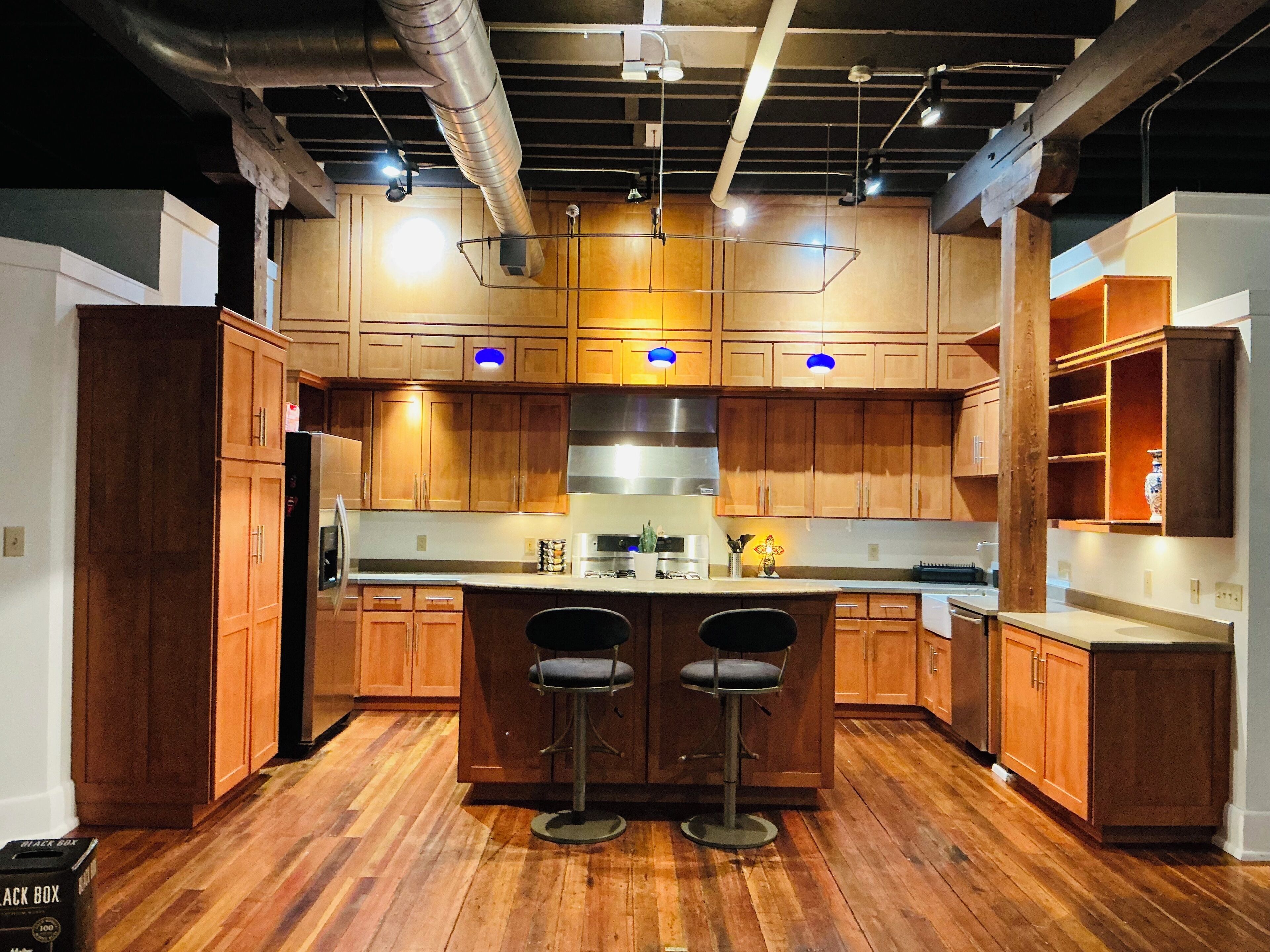 Enjoy the natural light streaming into the kitchen from the gorgeous 10 ft. x 10 ft. bump out windows framed across the top with original hand crafted glass plates matching the original wood glass plate chandelier hanging over top of the 16 ft. kitchen island we designed for guest pleasure.