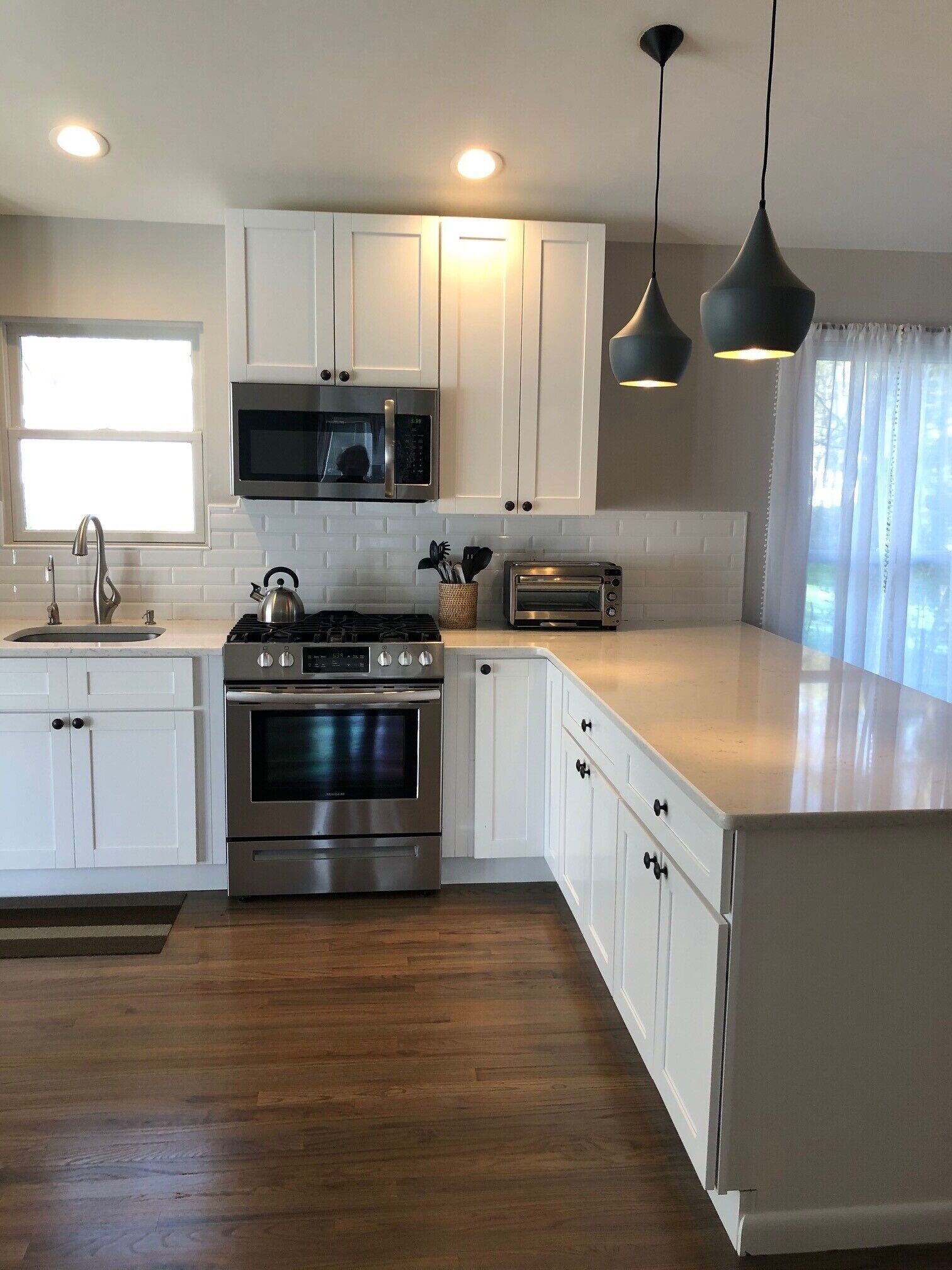 Bright and welcoming and decorated with a blend of antiques and restoration hardware, our home is designed with an eye to both style and comfort.