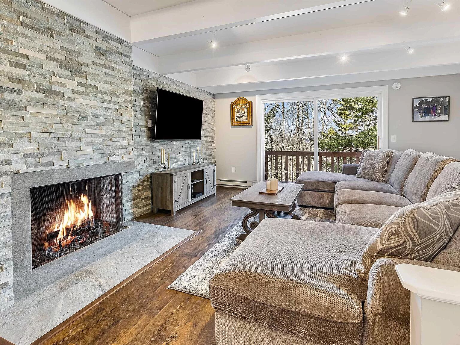Living room: Sectional Couch, with 2 sitting chairs- coffee table , in front of gag Fireplace Large Smart TV, S , walkout deck with table and chairs