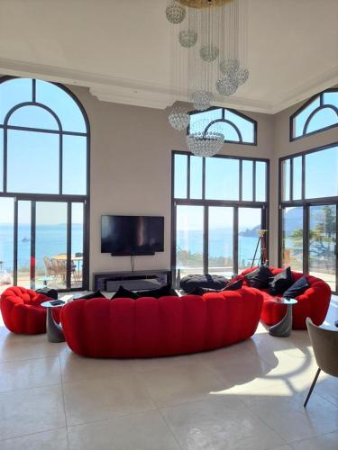 Appartement Horizon bleu vue panoramique sur mer offers accommodations in Théoule-sur-Mer, a 17-minute walk from Vallon de l'Autel Beach and 7.8 miles from Palais des Festivals et des Congrès. This property offers access to a balcony and free private parking. The apartment features an infinity pool and an elevator. Featuring a terrace and sea views, the apartment includes 2 bedrooms, a living room, flat-screen TV, an equipped kitchen, and 1 bathroom with a shower. Towels and bed linen are available in the apartment. The property has an outdoor dining area. There is an on-site bar. Parfumerie Fragonard – The History Factory Grasse is 15 miles from the apartment, while Musee International de la Parfumerie is 15 miles from the property. Nice Côte d'Azur Airport is 23 miles away.