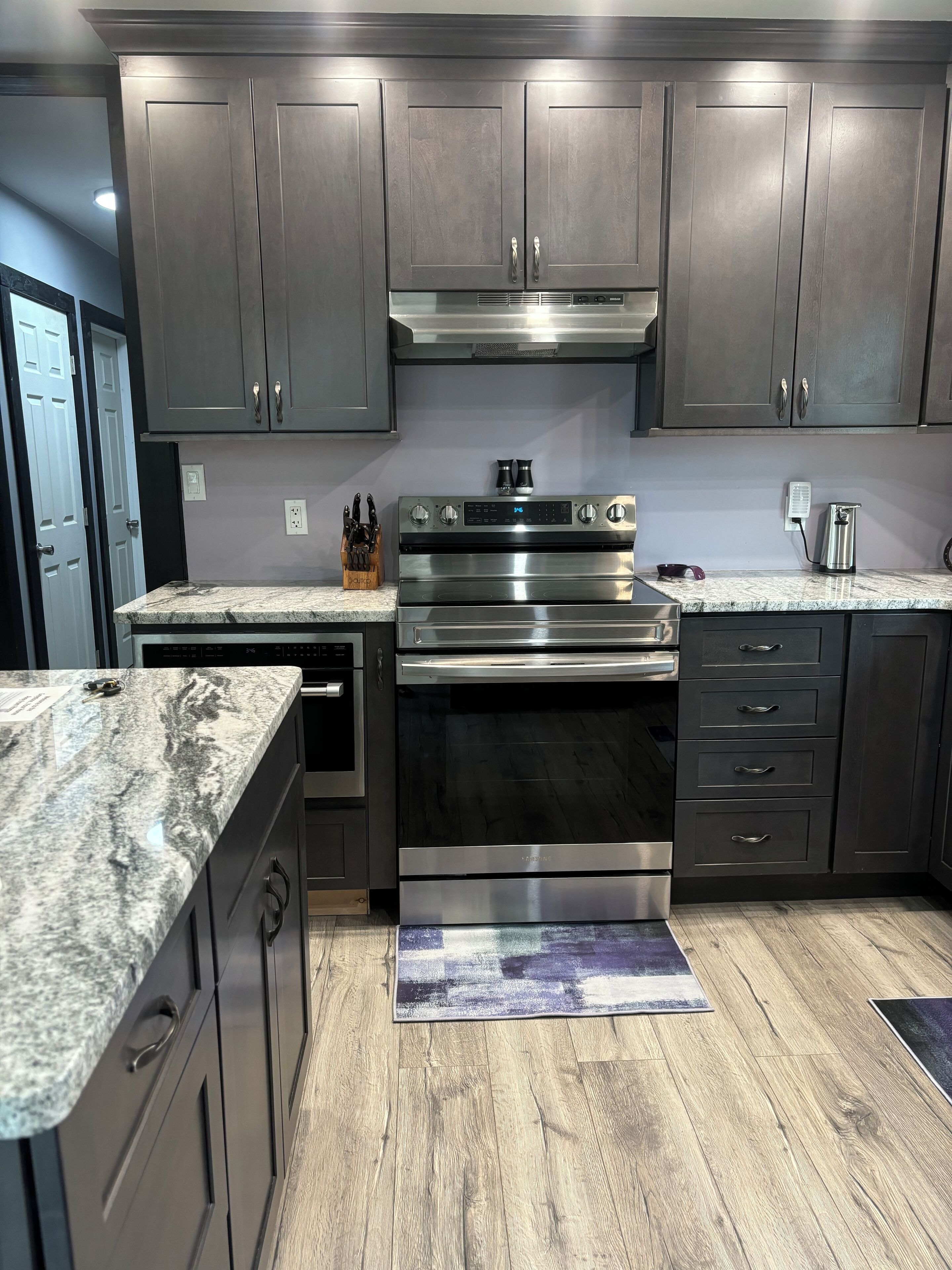 You will be blown away by our kitchen! It's fully stocked with everything you need and more. You'll be captivated by the sleek granite countertops, modern stainless steel refrigerator, and exquisite soft close cabinets. While there's no traditional stove, we've got you set up with a countertop single burner and all in one microwave/air fryer giving you plenty of options to whip up your meals. And that's not all – we've added some extra fun with a shaved ice machine, cotton candy maker, popcorn popper, and coffee bar. It's a kitchen like no other!